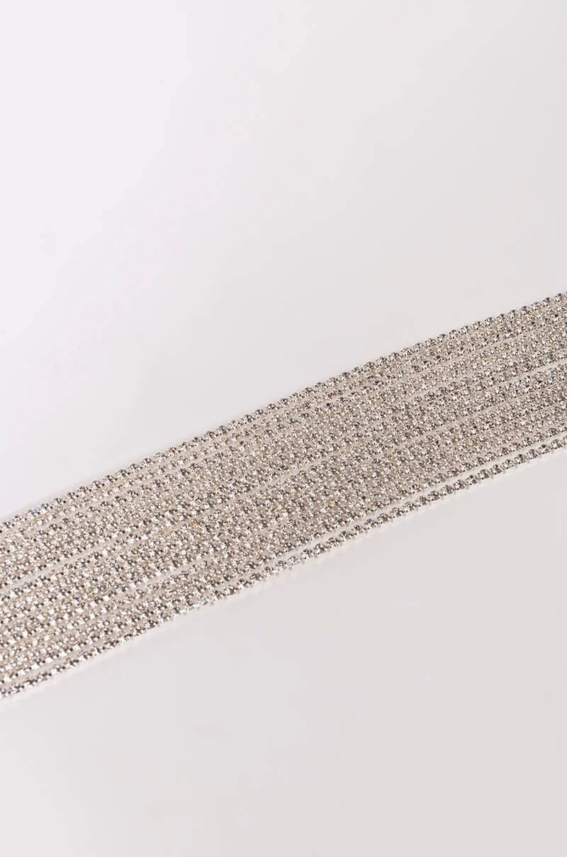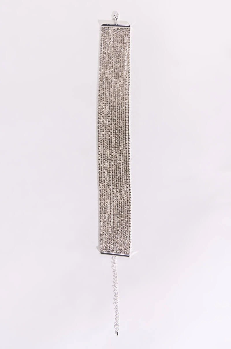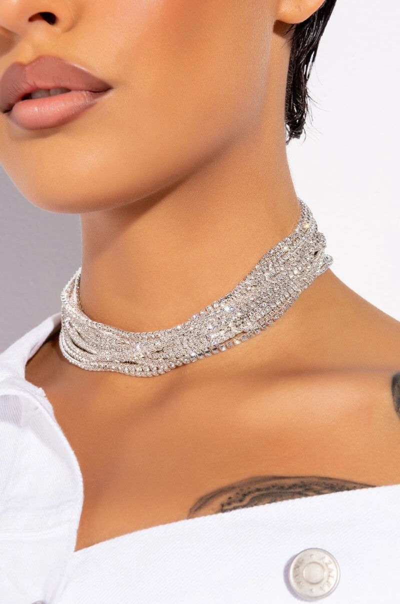 The AKIRA Label All Tings Icy Layered Rhinestone Choker is a rhinestone link statement piece complete with a multi-chain choker base, a draped silhouette, a single lobster claw clasp, and silver metallic hardware. Complete your Y2K look with this glam necklace.