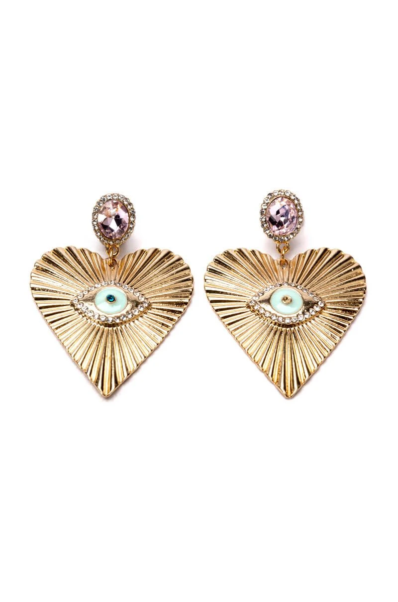 The AKIRA Label Always Watching Statement Drop Earrings are made from a faux gold metal base and feature hearts with rhinestone outlined evil eye detailing and opulent, rhinestone gem bar lobe posts. Complete with post back-style closures.
