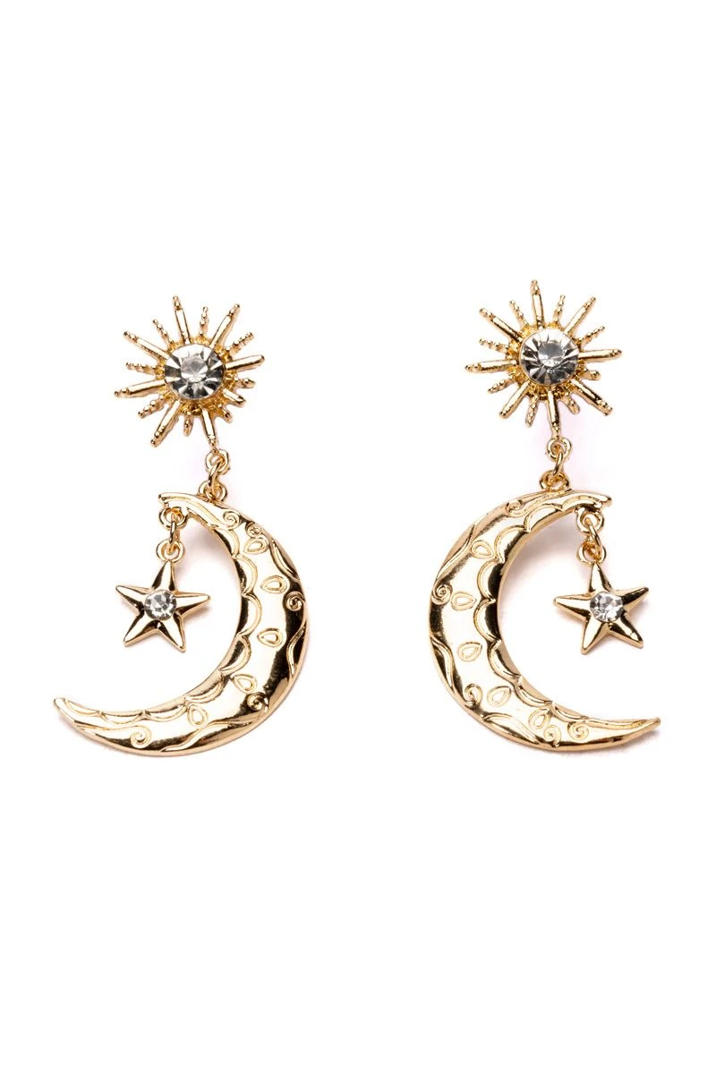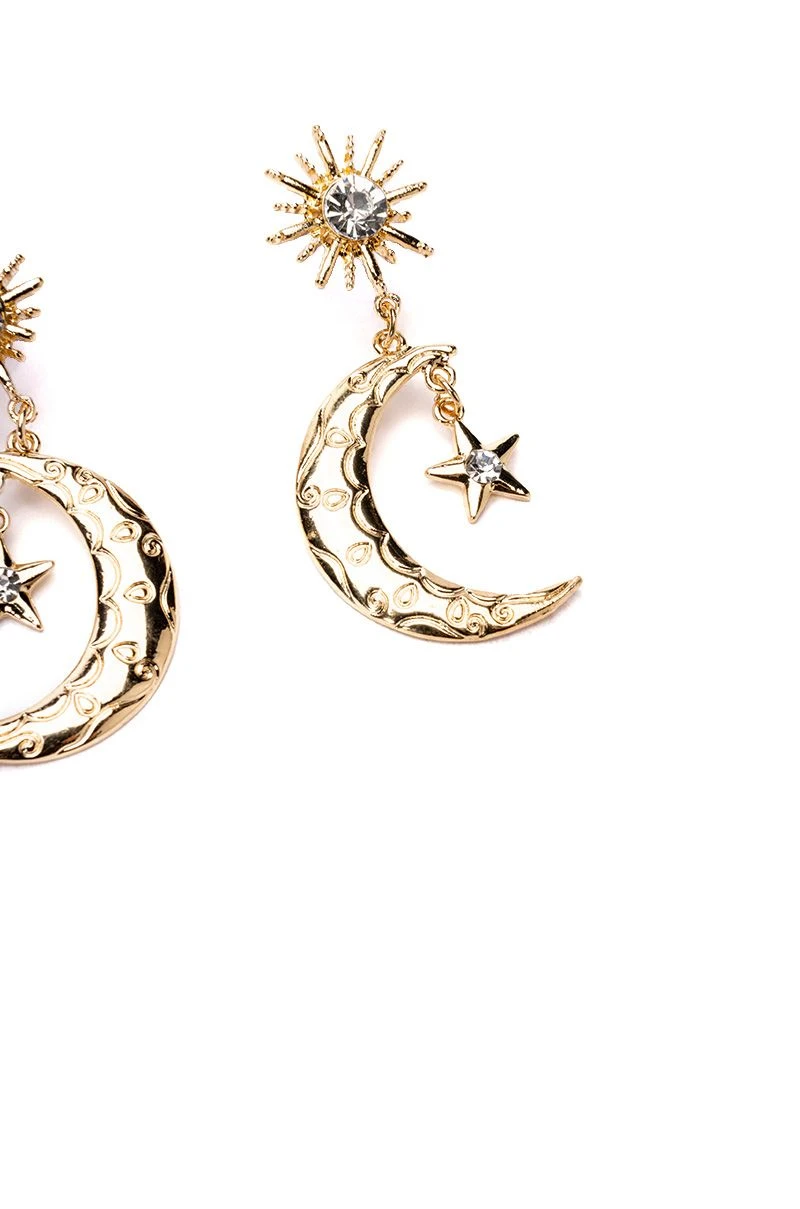 An essential for your full moon ritual, The AKIRA Label Astro Girl Embellished Earrings are made from a faux gold metal base and feature textured crescent moons with dangling rhinestone-embellished stars. Complete with sun lobe posts, embellished with opulent, rhinestone gems and post back-style closures.