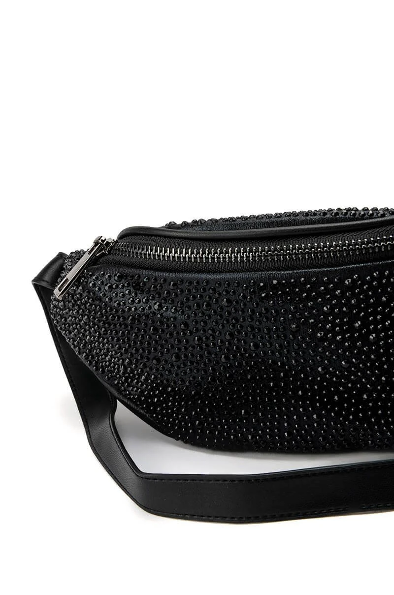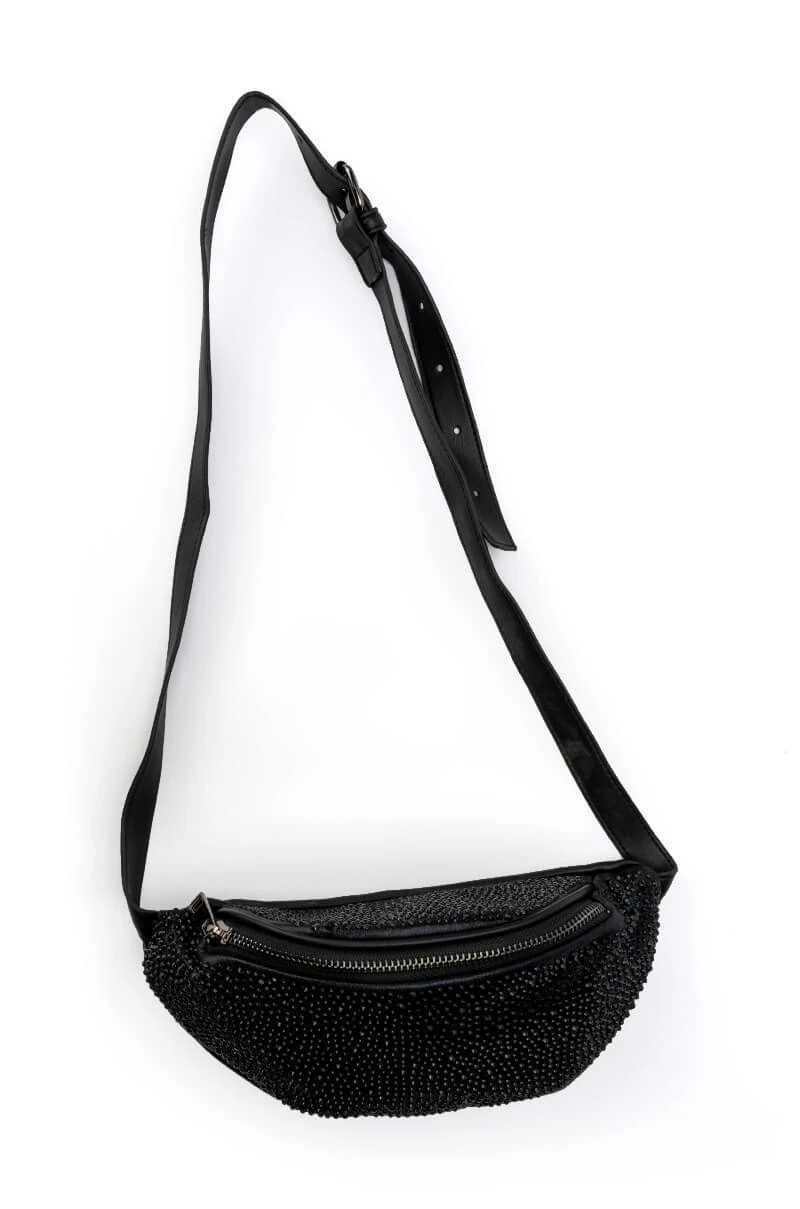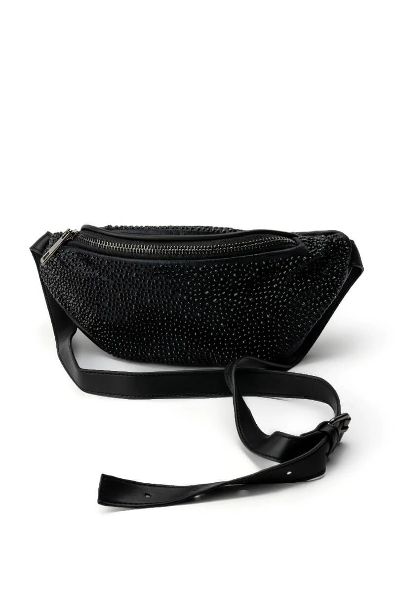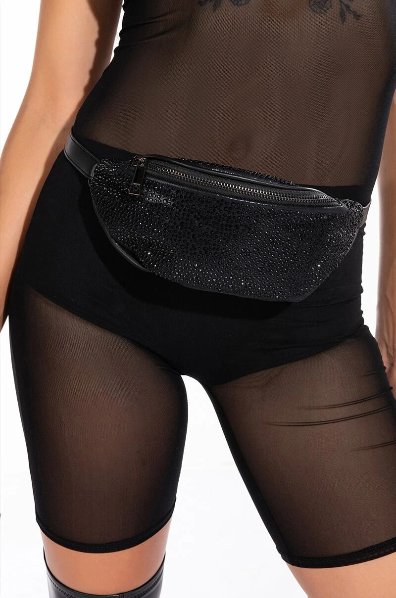The AKIRA Label Azure Black Fanny Pack is made from a soft vegan leather fabrication and features rhinestone detailing, an inner pouch, zippered front, and an adjustable vegan leather buckled strap.