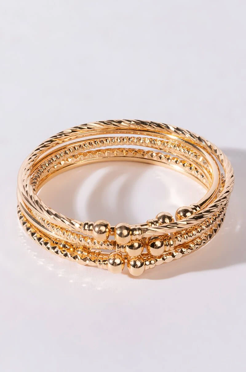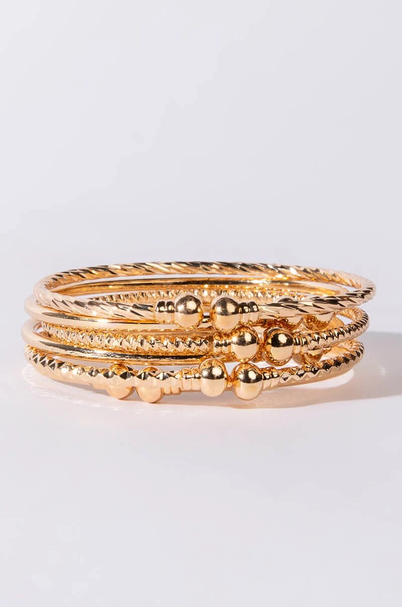 The AKIRA Label Baby Bangle Set features six one-size-fits-most bangles complete with a faux gold metallic base, unique textured detailing, and circular end caps. Wear them separately or stack them to add some extra-ness to your ensemble!