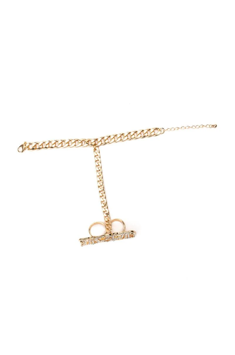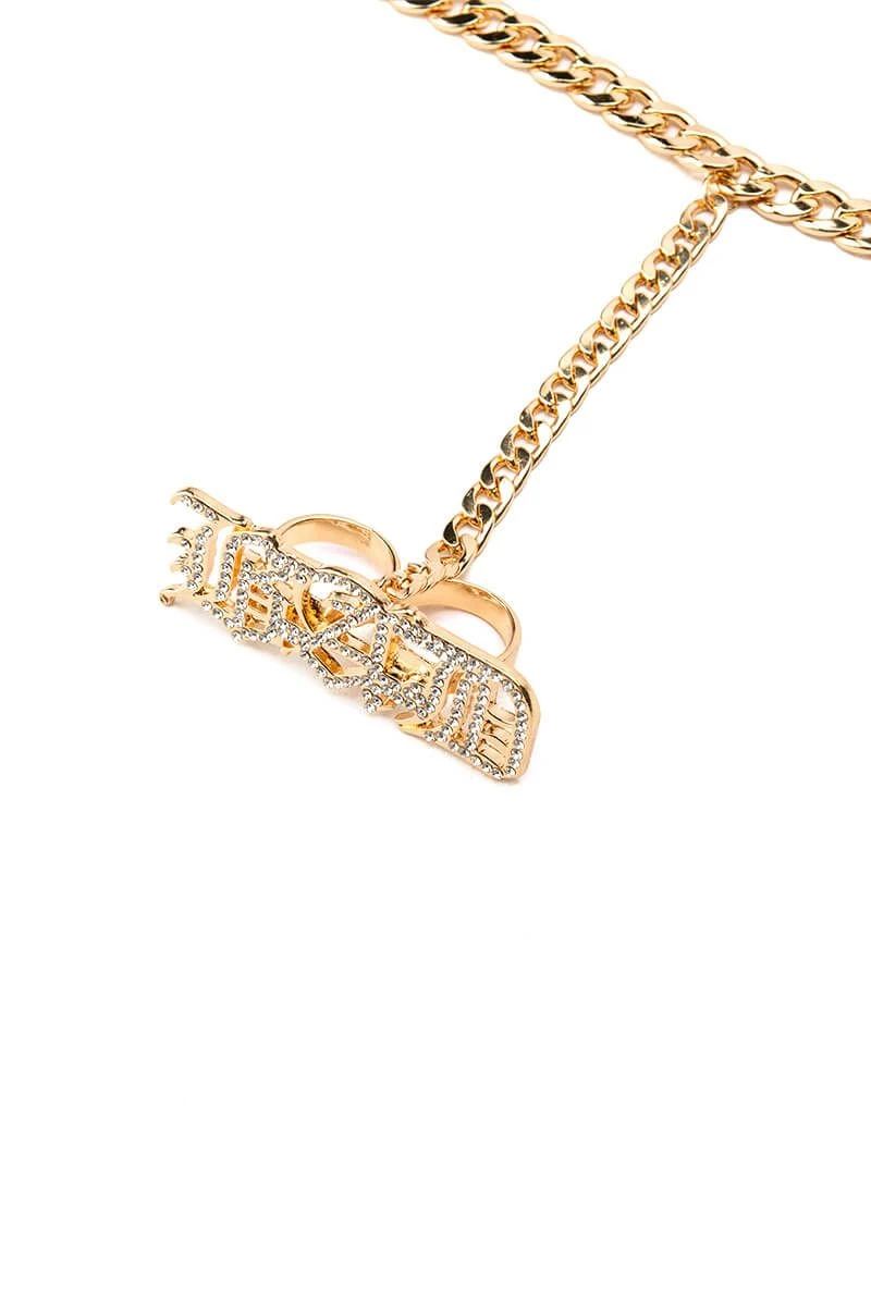 The AKIRA Label Baddie Hand Armor is made from a faux gold metal base and features a curb chain link bracelet that trails up the hand culminating in a doubled ring with a pave rhinestone “BAD”, gothic text lettering design.