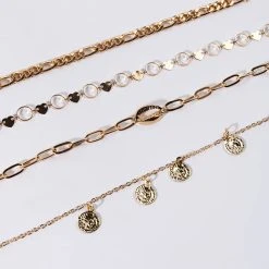 Travel along in peace and harmony with the AKIRA Label Bangkok Anklet Set! This anklet set features two anklets made from faux gold bases- one with multicolor leaf designs, and the other with an elongated chain link base and elephant, heart, hamsa symbol, and evil eye charms. Both are complete with adjustable lobster claw closures.