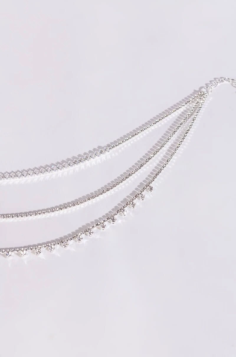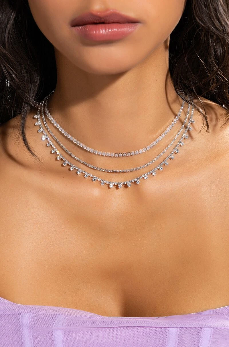 The AKIRA Label Big Miss Rhinestone Choker Set is a single rhinestone link necklace featuring a silver metallic base, choker-style silhouette, and am adjustable lobster clasp fastening.