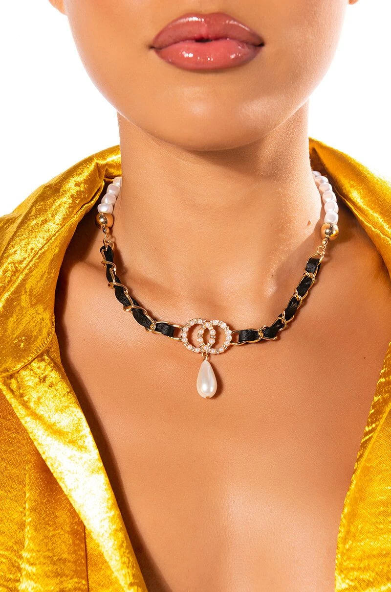 Enchantรฉ! The AKIRA Label Call Me Coco Pearl Chain Necklace is made from a faux gold metal base and features pearl chain ends with gold balls and a ribbon chain center with a rhinestone and pearl-detailed linked circles charm. Complete with pearl dangle details and an adjustable lobster claw closure.