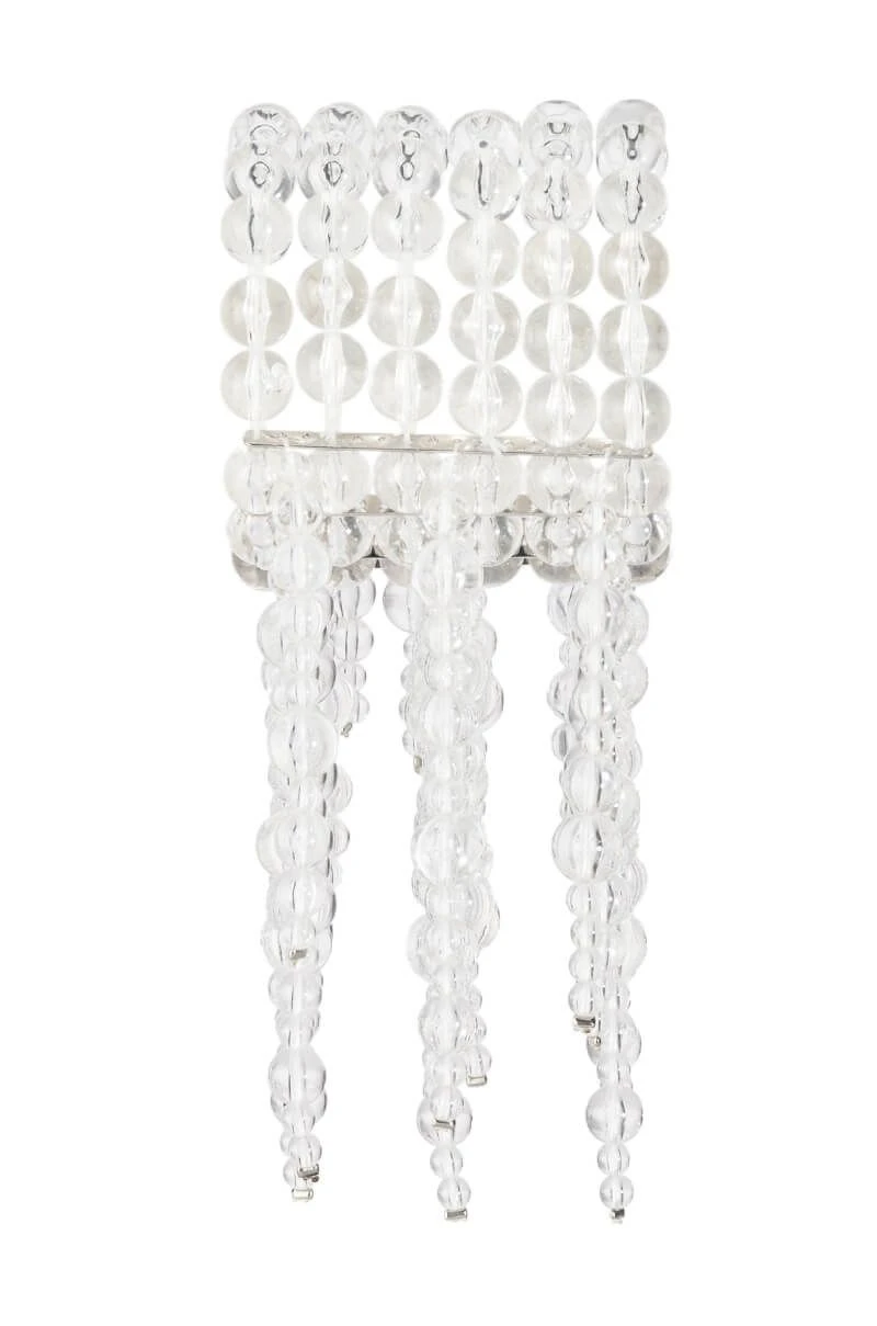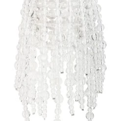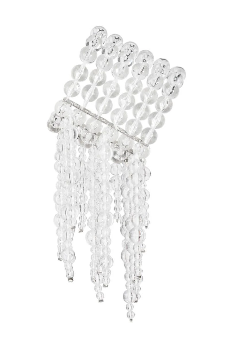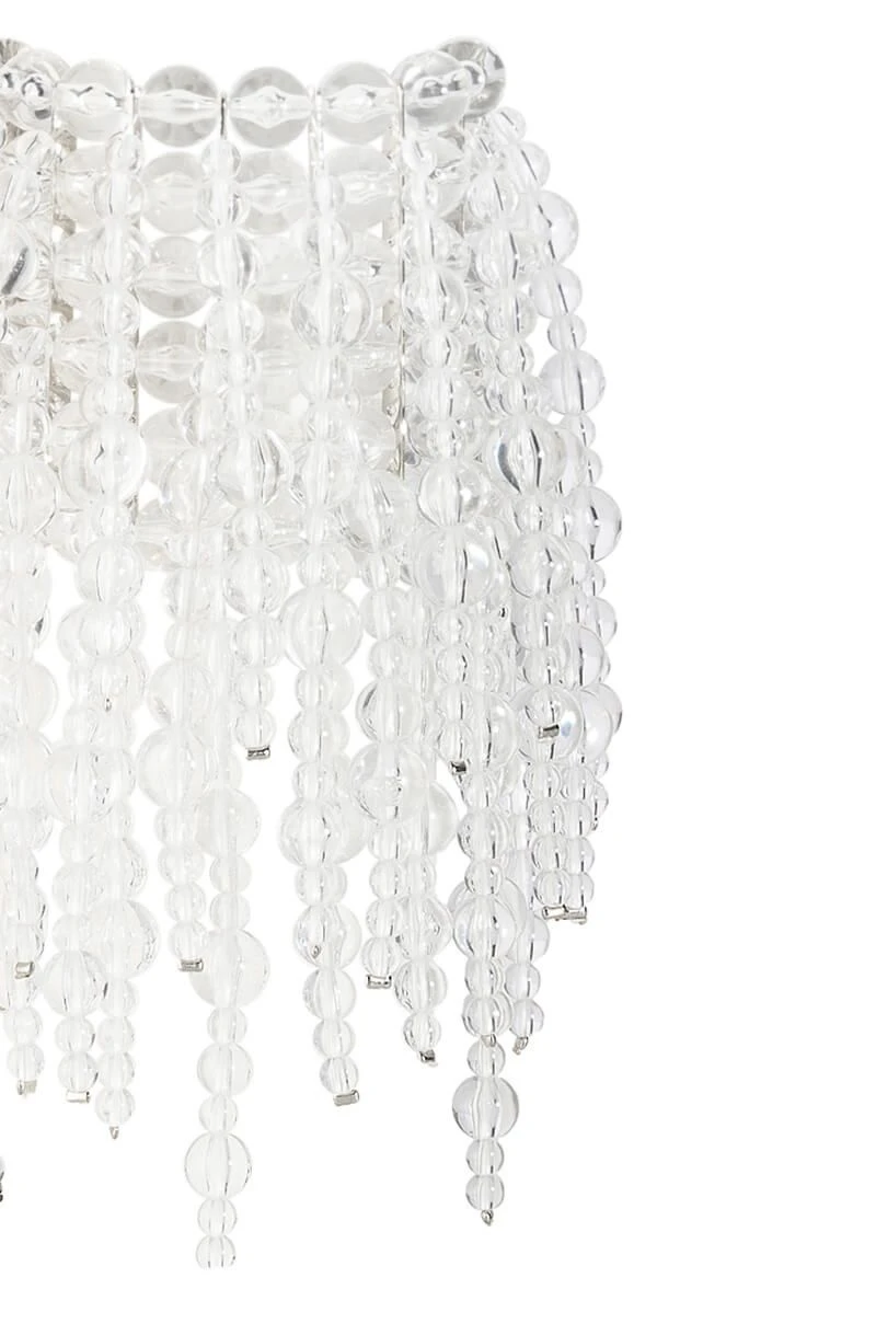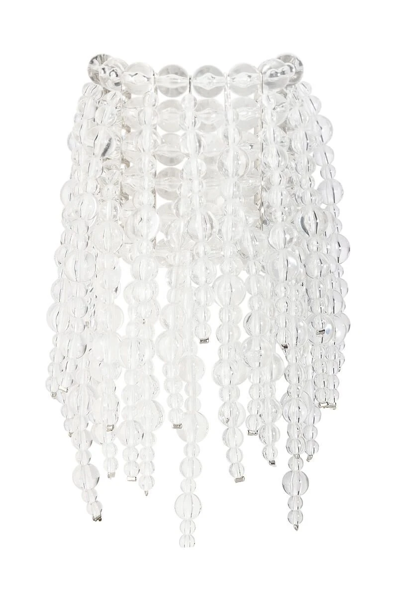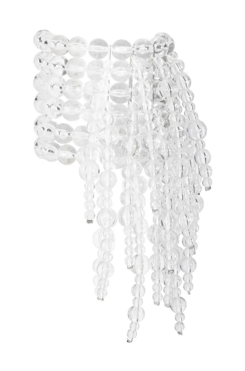 The AKIRA Label Clear Vision Statement Bracelet is an ornate beaded cuff bracelet featuring an elasticized base, clear acrylic beaded fringe, and metallic spacers.