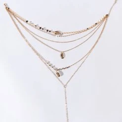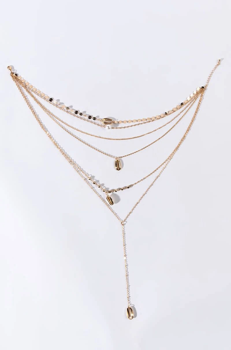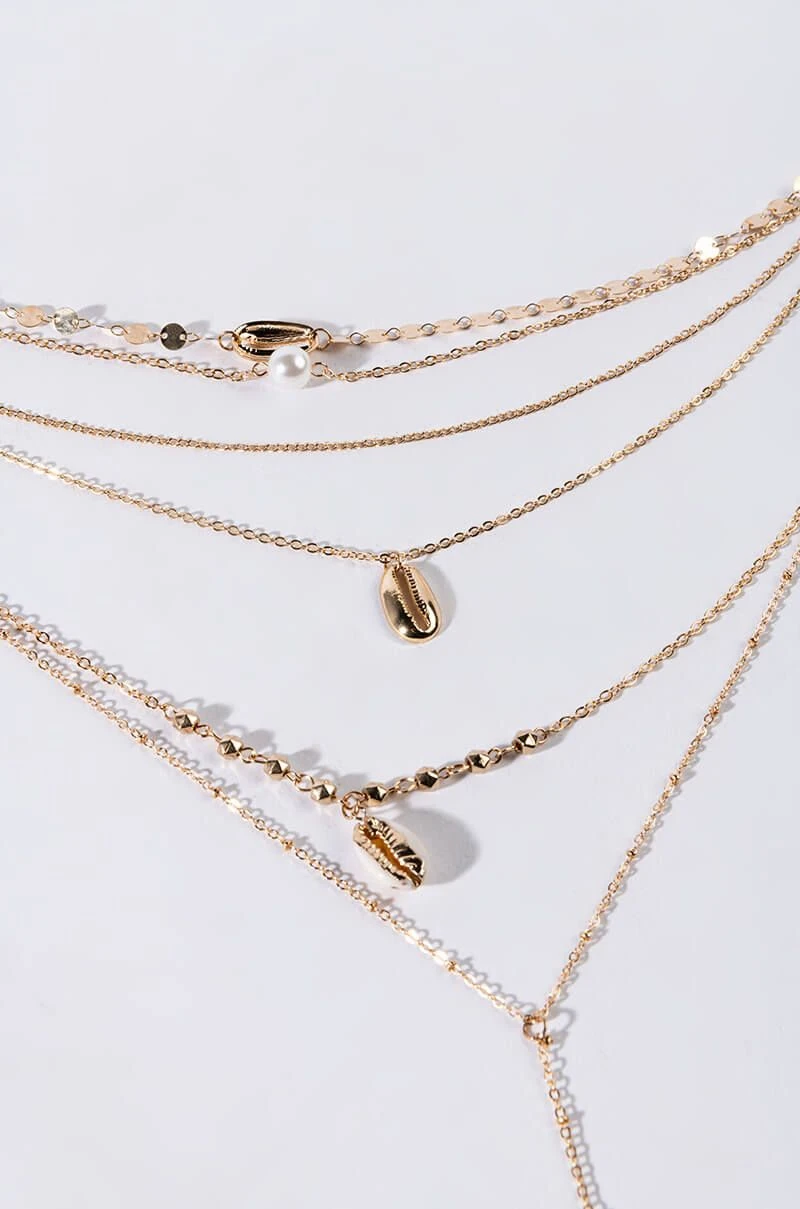 The AKIRA Label Clear Waters Necklace Set is a playful layered necklace featuring a faux gold chain link base, faux gold cowrie shell detailing, plastic shell accents, an extended dangle silhouette, and a single adjustable claw clasp closure.