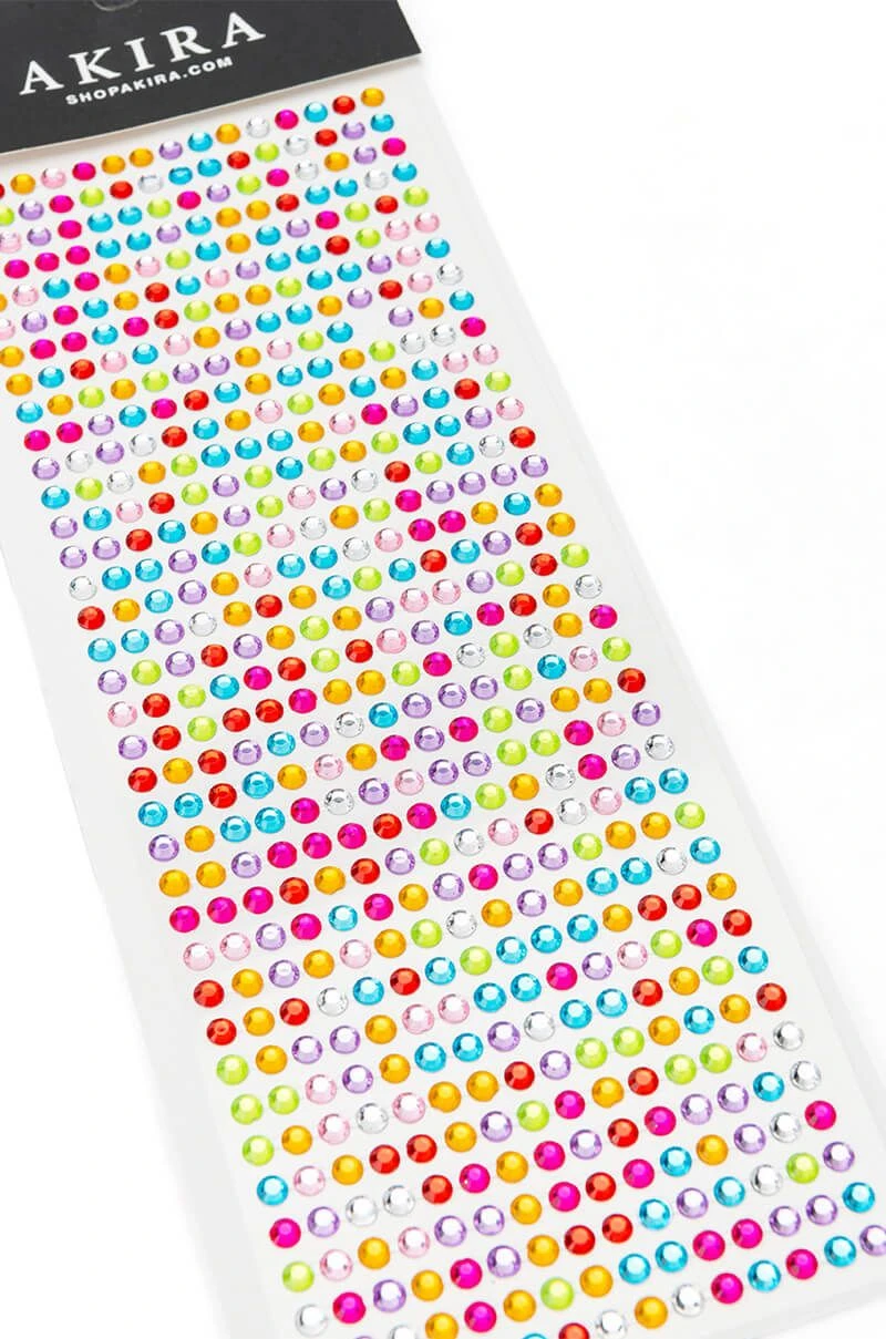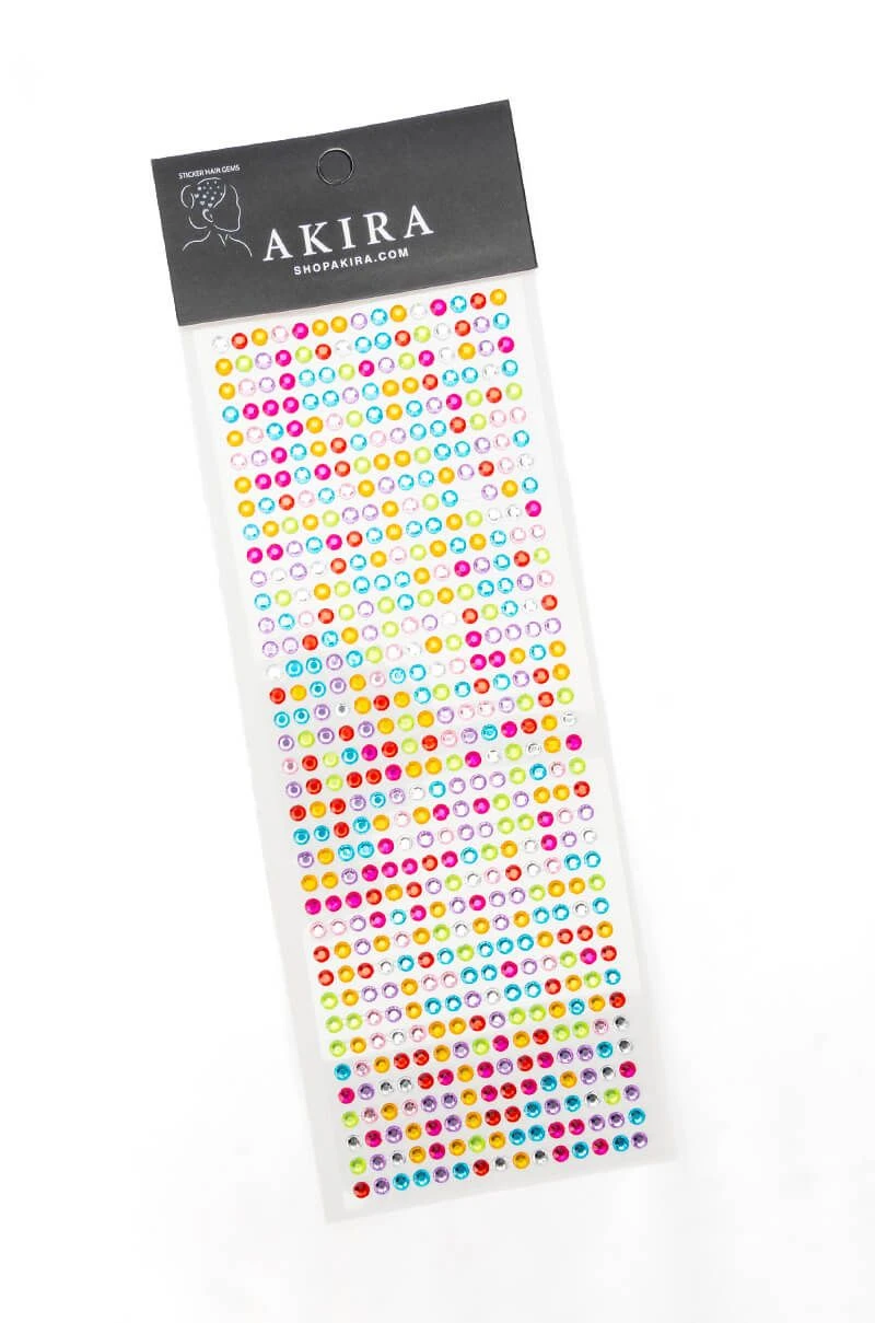 The AKIRA Label Colorful Small Hair Gem Stickers are an adhesive, single use hair accessory featuring small, circular multi-color rhinestone stickers on a clear backing.