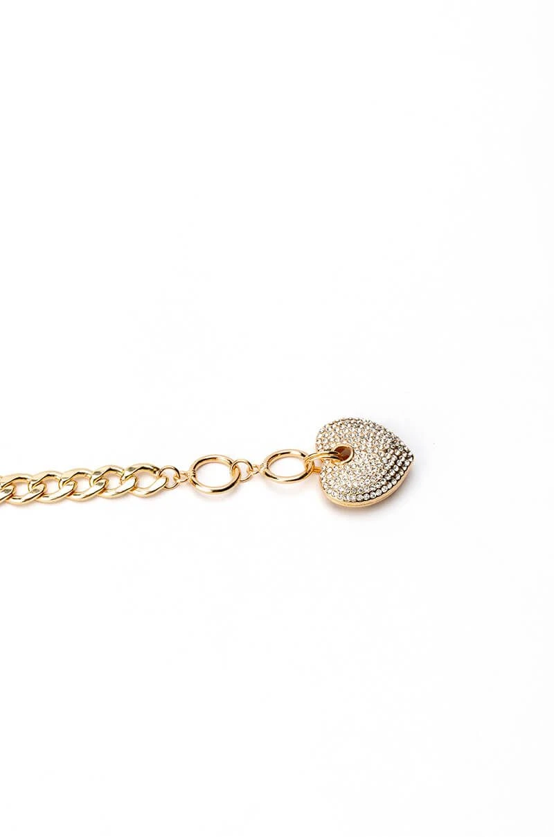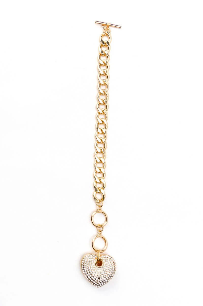 The AKIRA Label Crazy In Love Bracelet is made from a faux gold metal and features a flat curb chain link base with a pave rhinestone heart pendant and a pave rhinestone toggle closure.