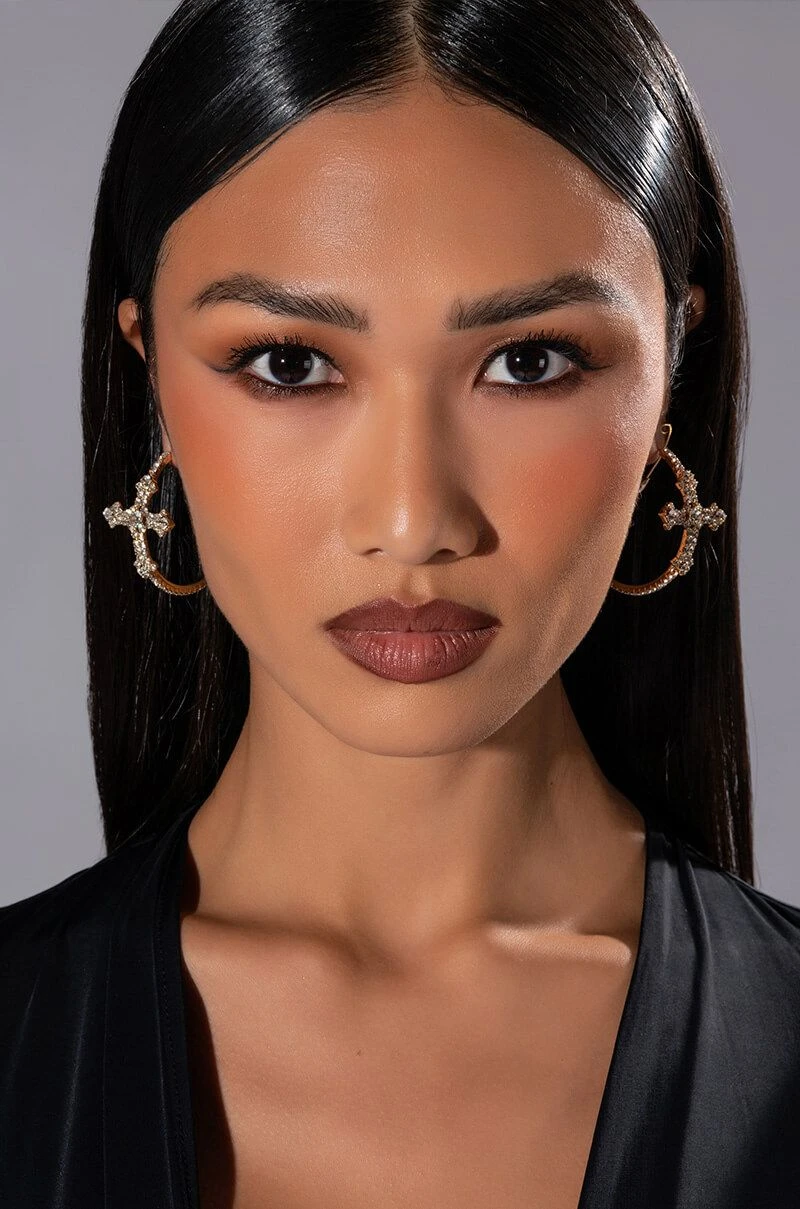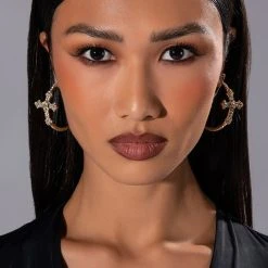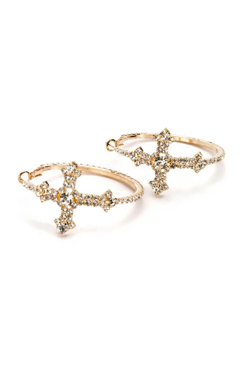 The AKIRA LabelCross My Heart Embellished Hoops are an oversized hoop earring featuring a faux gold base, rhinestone-embellished detailing, sculptural cross accents, and a latch-back fastening.