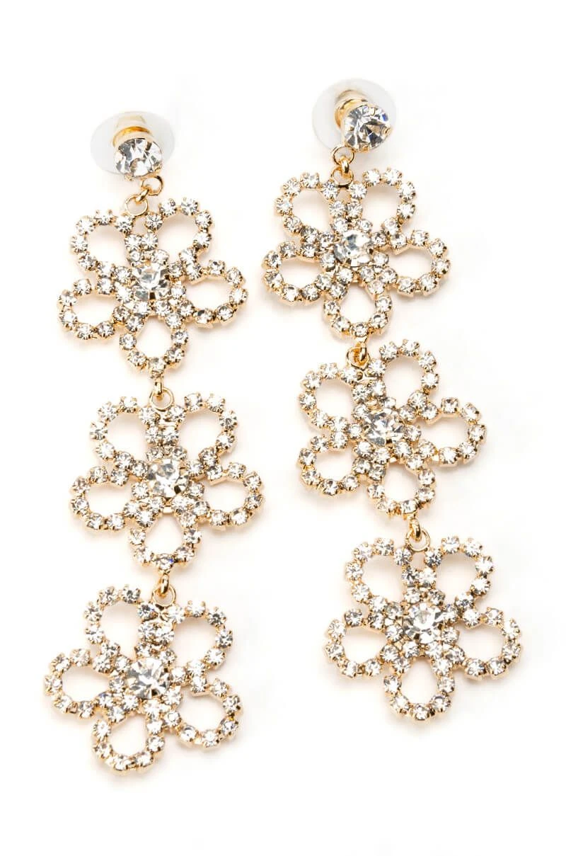 The AKIRA Label Daisy Love Rhinestone Dangle Earrings are made from a faux gold base and feature a circular rhinestone stud post, rhinestone detailing, and open rhinestone daisy drop accents.