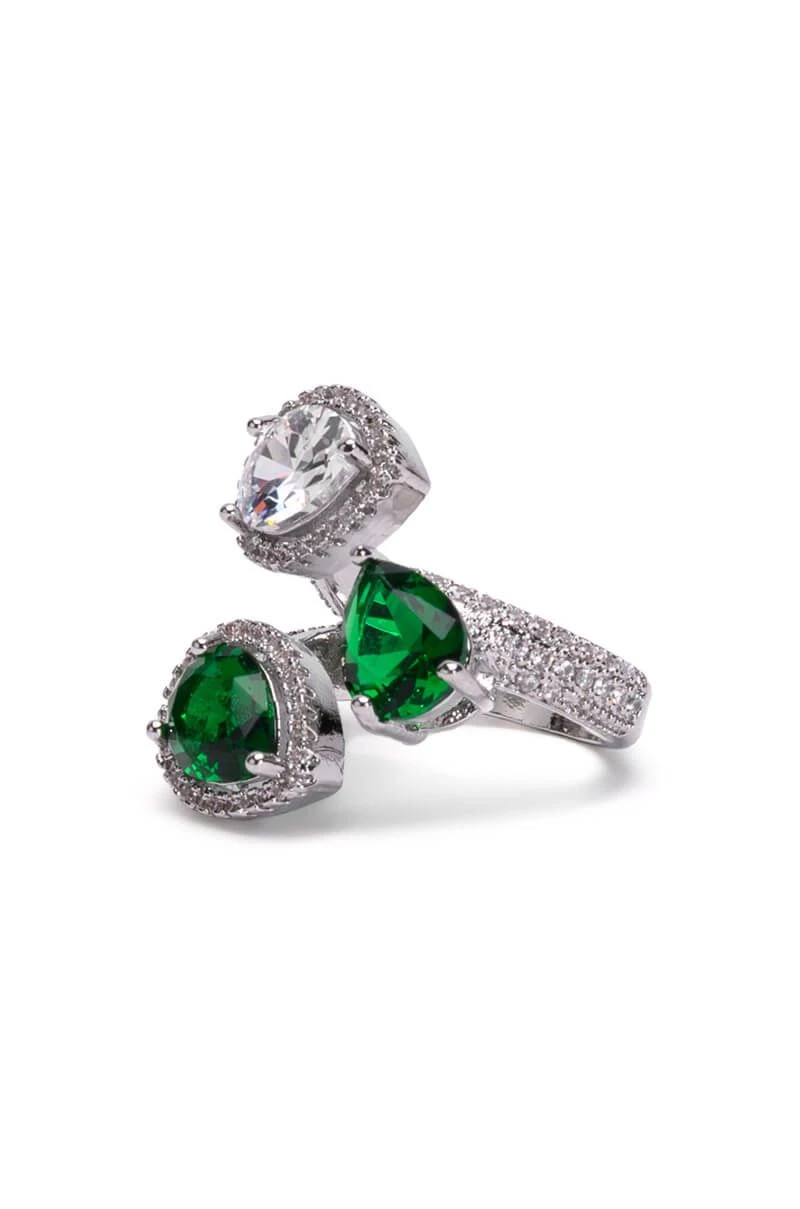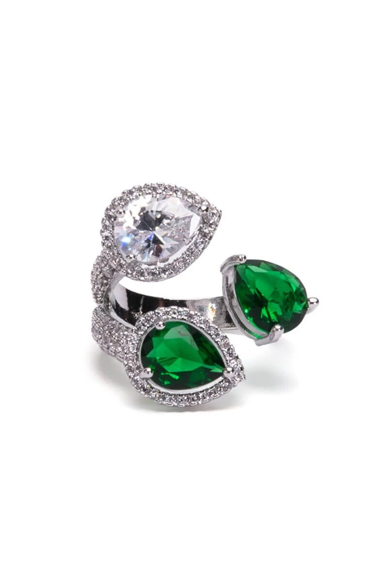 The AKIRA Label Dirty Martini Rhinestone Cocktail Ring is made from a faux silver metal base and features a single rhinestone-detailed split band with three rhinestone-trimmed clear and green teardrop gems.