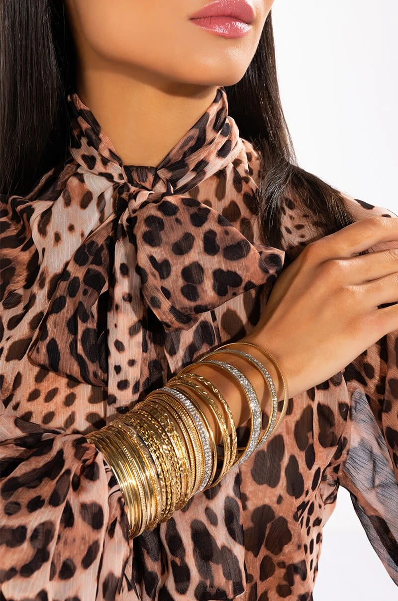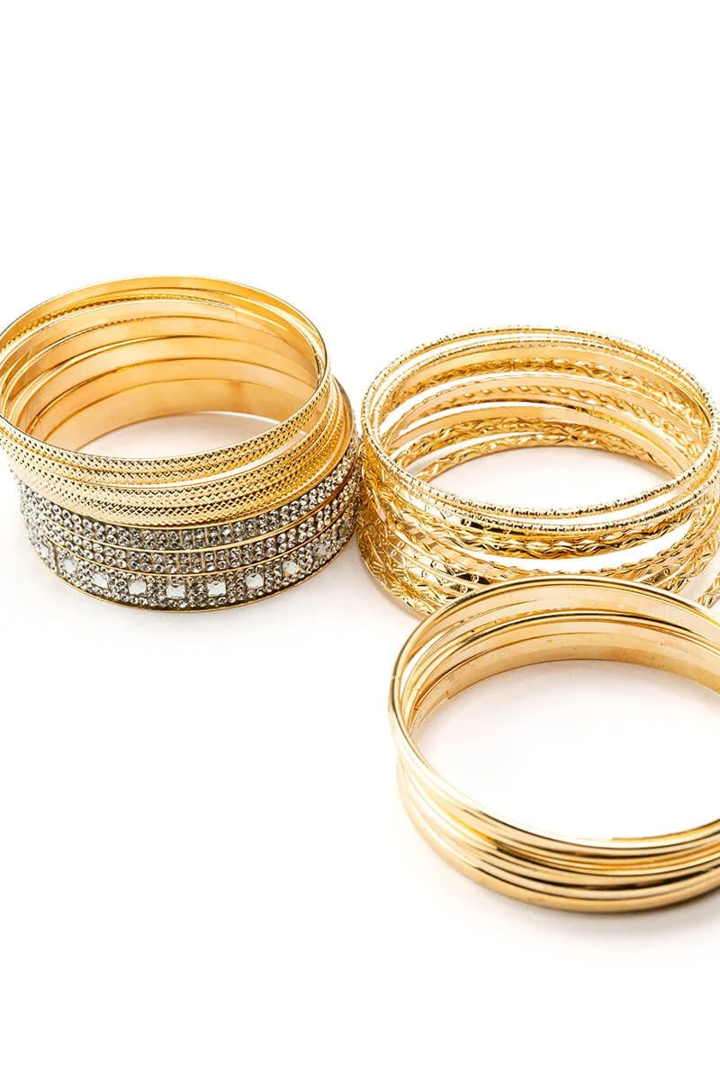 The AKIRA Label Doing Too Much Bangle Set features twenty eight one-size-fits-most bangles complete with a faux gold metal base, rhinestone embellishments, and unique textured detailing. Wear them separately or stack them to add some extra-ness to your look!