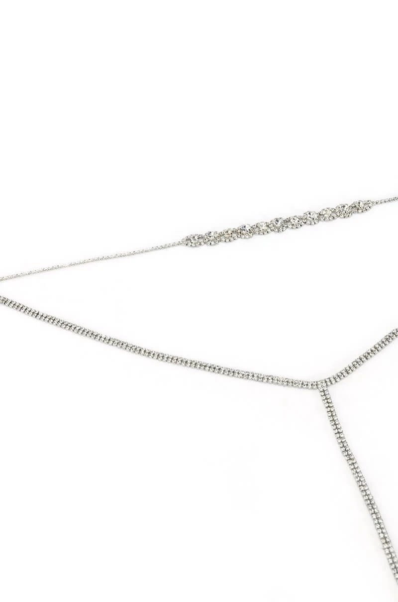 The AKIRA Label Duchess Rhinestone Lariat Choker Necklace is made from a faux silver metal base and features an ornate rhinestone choker connected to an extended rhinestone link lariat. Complete with an adjustable lobster claw closure.