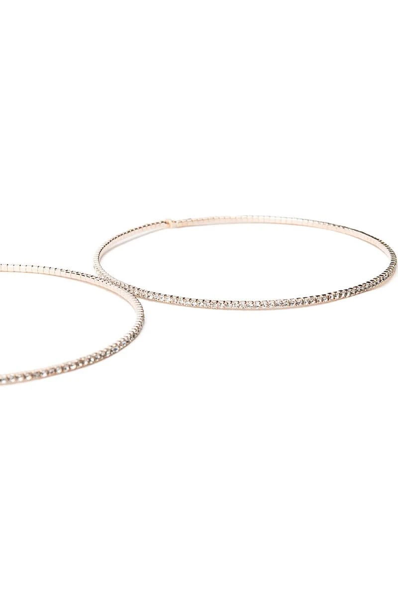 The AKIRA Label Fine Line Rose Gold 80MM Rhinestone Hoops are a slender 80mm rose gold metallic hoop earring featuring pave rhinestone detailing and a classic post back fastening. Perfect size for adding sparkle to any ensemble!