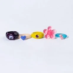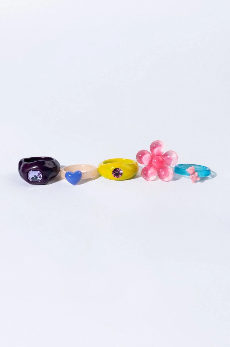 The AKIRA Label Flower Power Candyland Ring Set is a collection of five individual resin rings with whimsical charms and gem accents. Wear them separately or together to add some unique color and texture to your look!