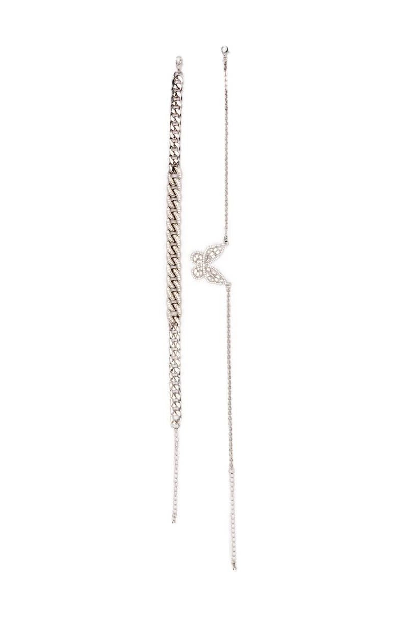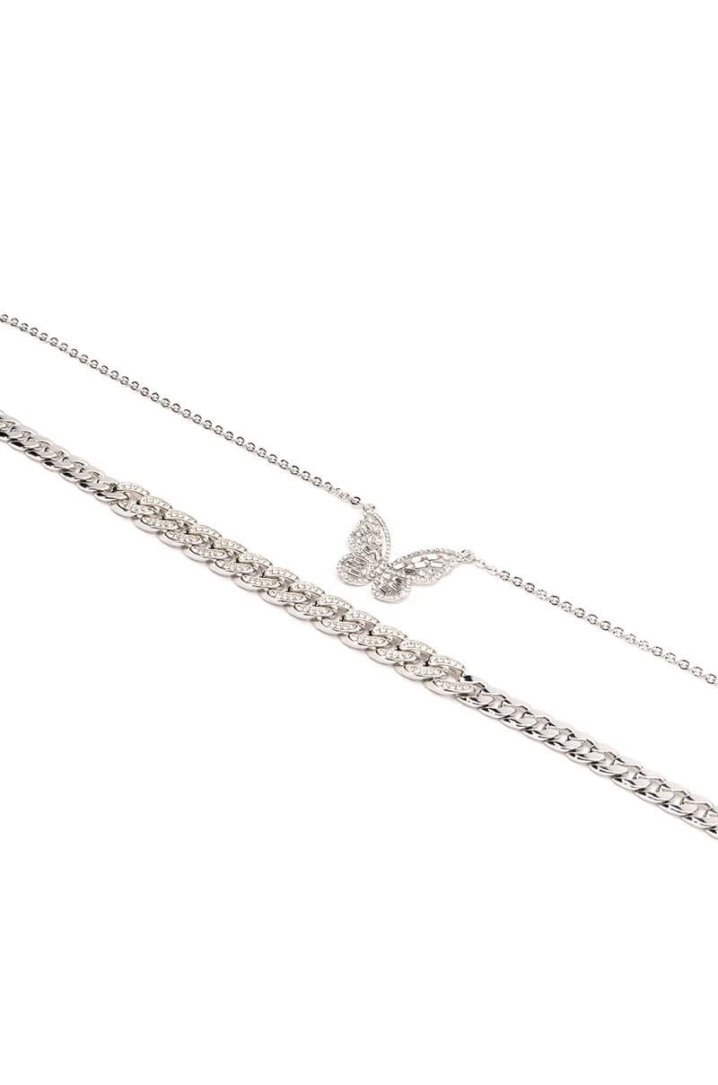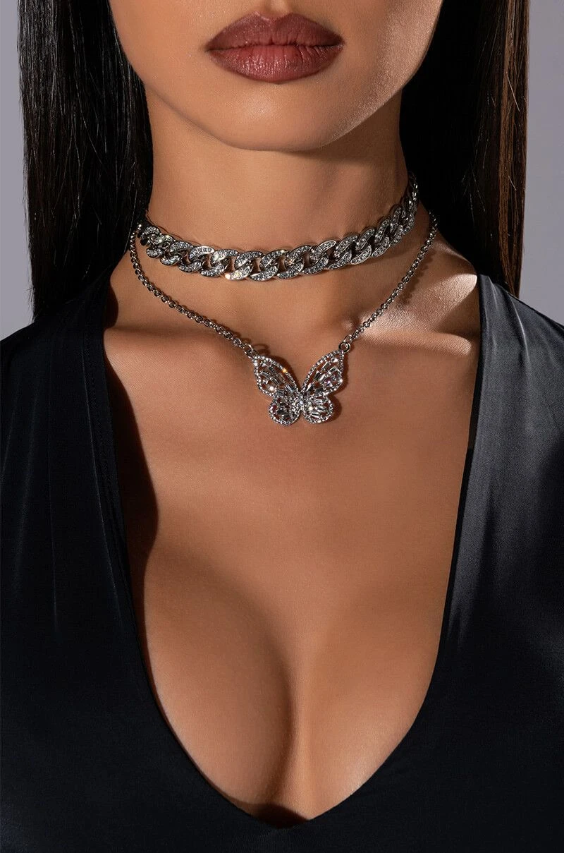 The AKIRA Label Flutter By Rhinestone Layered Necklace is made from a faux silver metal base and features: a curb chain link necklace with pave rhinestone detailing and a thin chain link necklace rhinestone-detailed butterfly pendant. Both are complete with adjustable lobster claw closures. Style these blingy pieces together for all of the drippy bling.