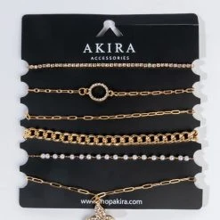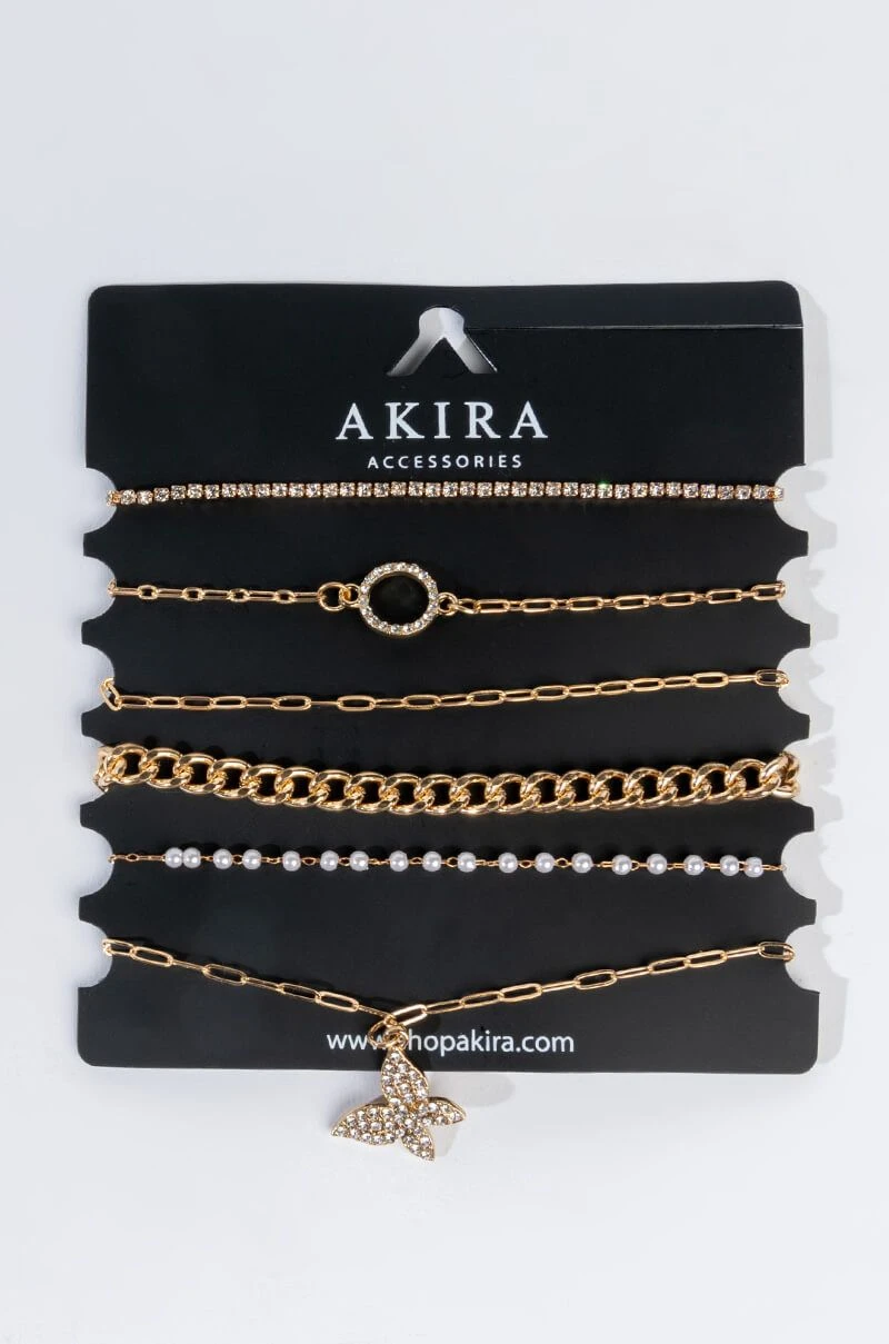 The AKIRA Label Flyest Bracelet Set features six separate gold chain pieces: one features a pave butterfly charm. Includes one pearl beaded bracelet, one chain link piece with a pave o-ring accent, one rhinestone link piece, and two chain bracelets of varying styles. Each complete with adjustable lobster claw fastenings.