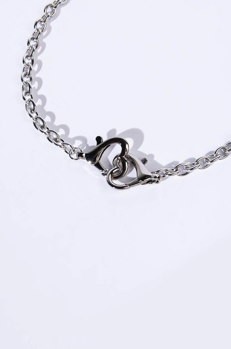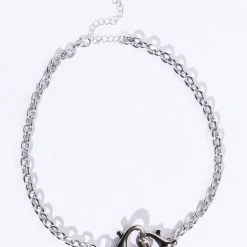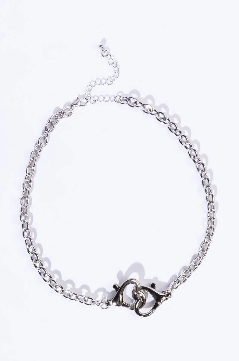 The AKIRA Label Forever Us Cuff Chain Necklace is a cable chain link piece featuring a faux silver metallic base, heart-shaped lobster claw cuff front details, and an adjustable back lobster claw clasp closure.