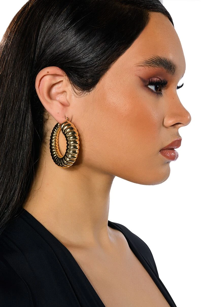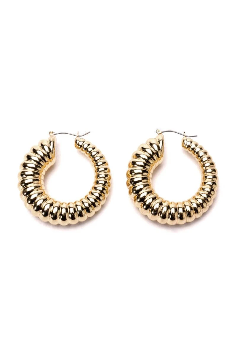 The AKIRA Label Go Time Textured Hoops are a set of door knocker hoops made from a faux gold metal base featuring a textured design, a medium hoop silhouette, and lever back fastenings.