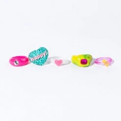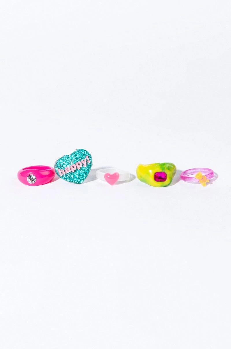 The AKIRA Label Happy! Candyland Ring Set includes five individual resin rings with gems and cutesy charms. Included is an adjustable ring with a glittery heart that says “happy!” on it. Wear these rings separately or style them together to add some unique color and Y2K vibes to your look!