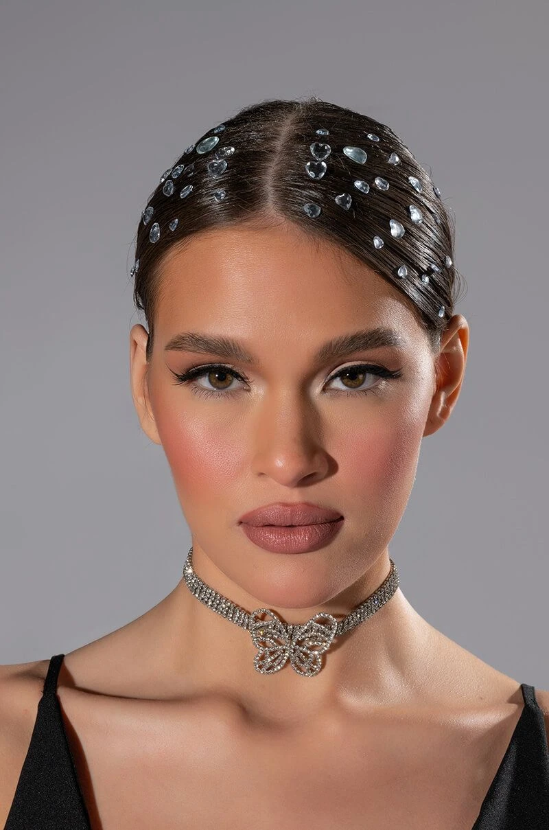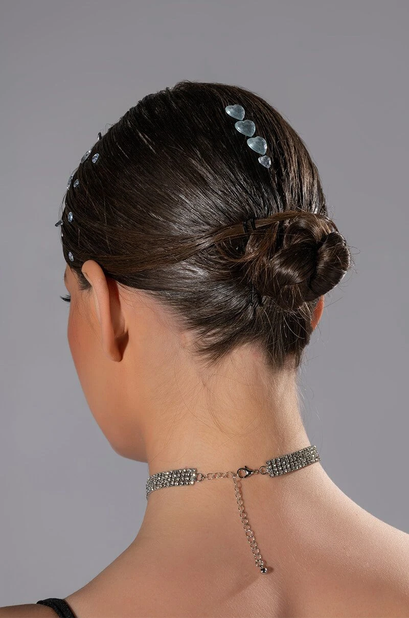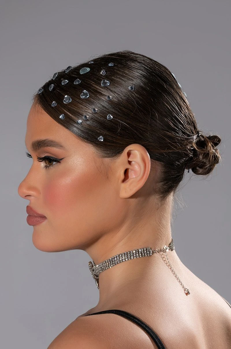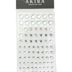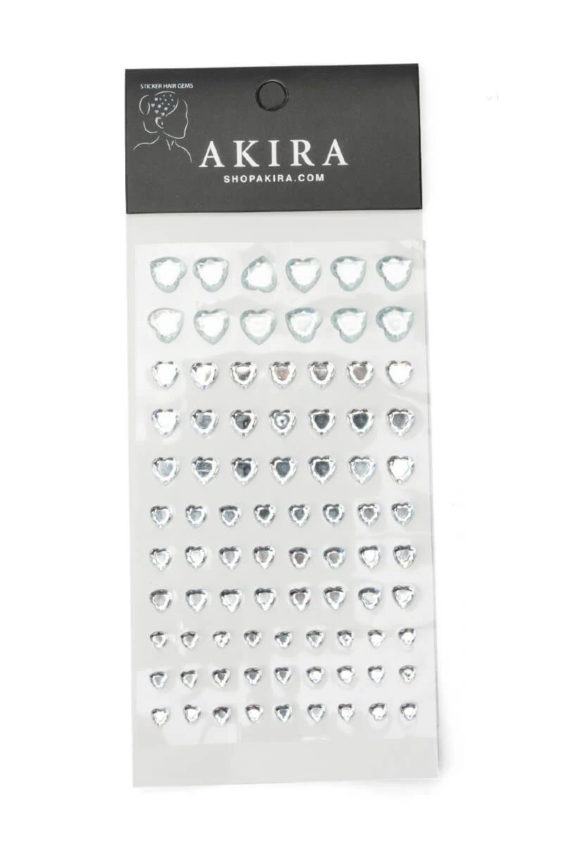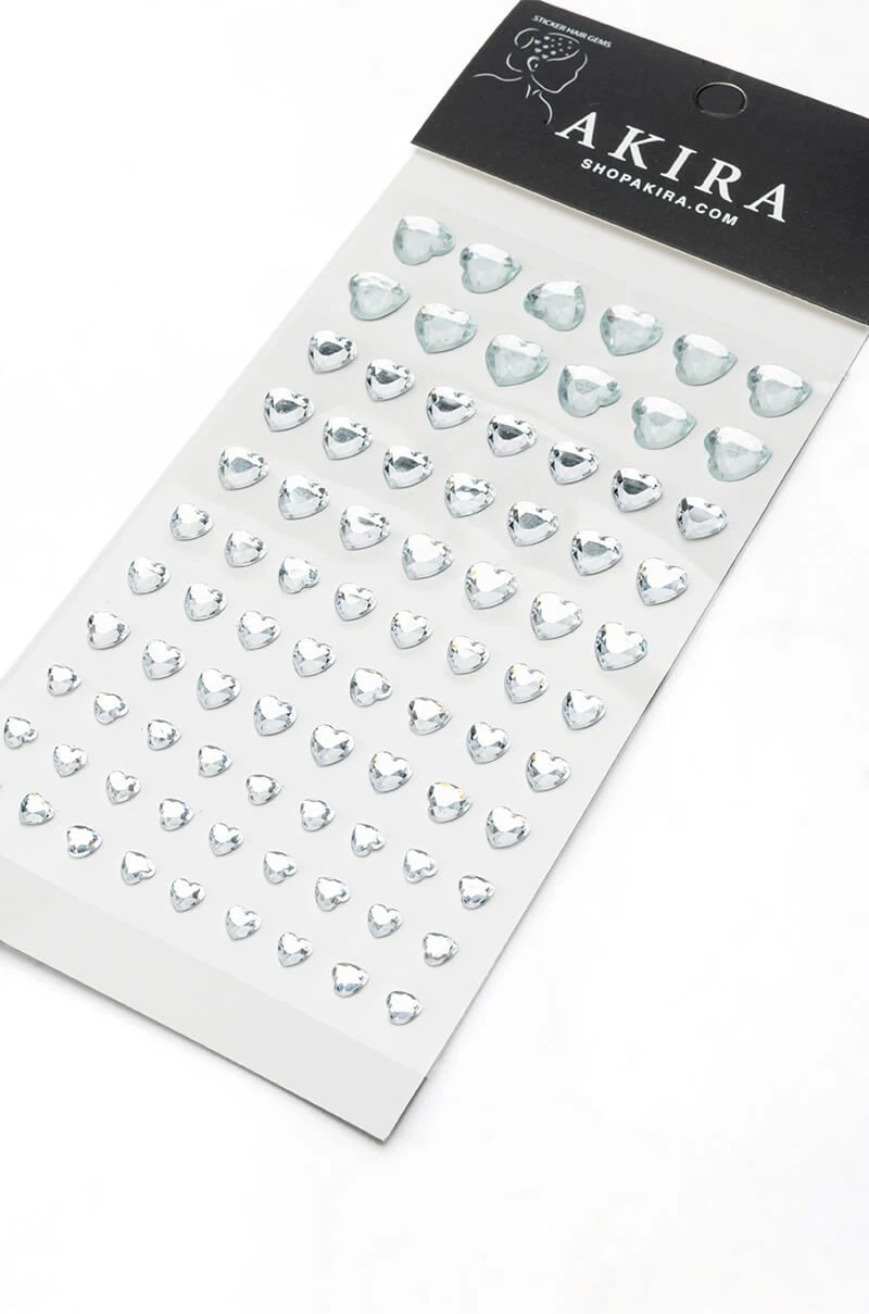 The AKIRA Label Heart Hair Gem Stickers in Silver are an adhesive, single use hair accessory featuring multicolor, heart-shaped rhinestone stickers of various sizes on a clear backing. This sheet includes 84 rhinestone hair gem stickers.