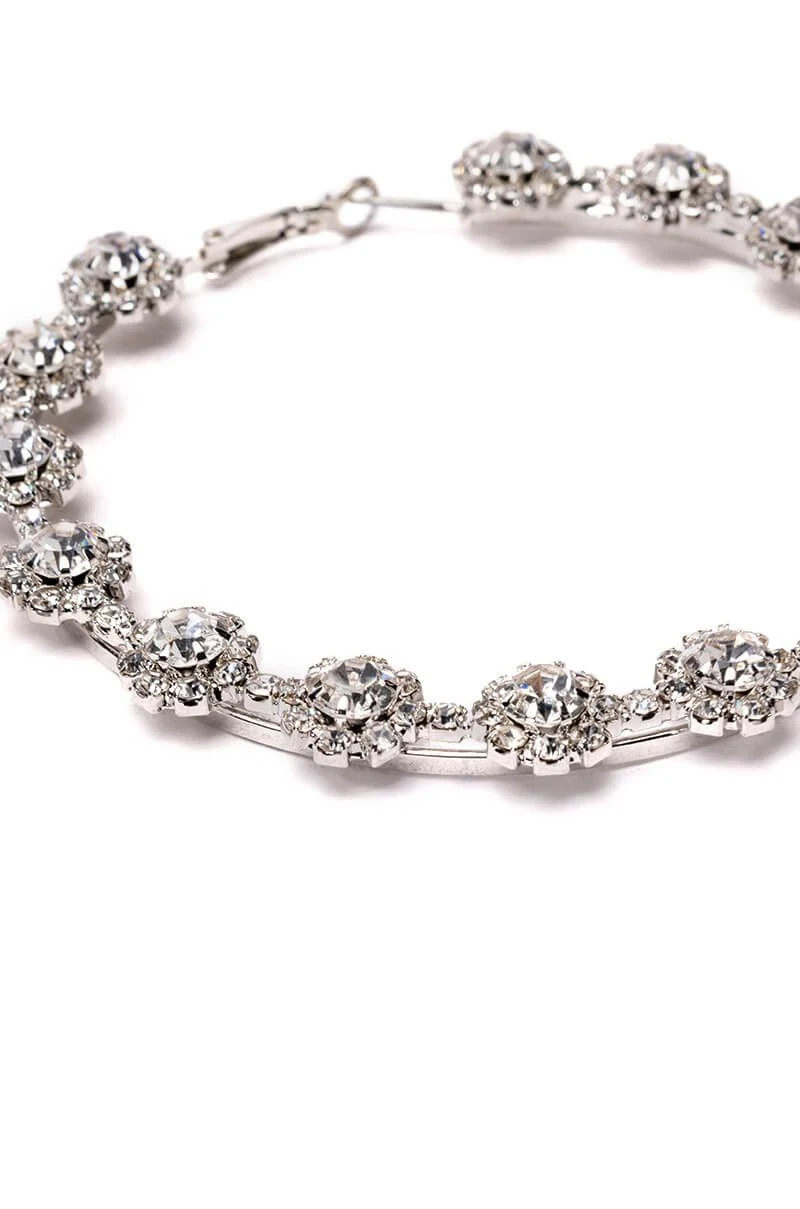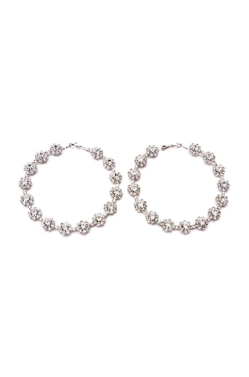 The AKIRA Label Here Comes Trouble are an oversized hoop earring featuring a rhinestone embellished silver metallic design with floral rhinestone detail, a circular silhouette, and lever back fastening.