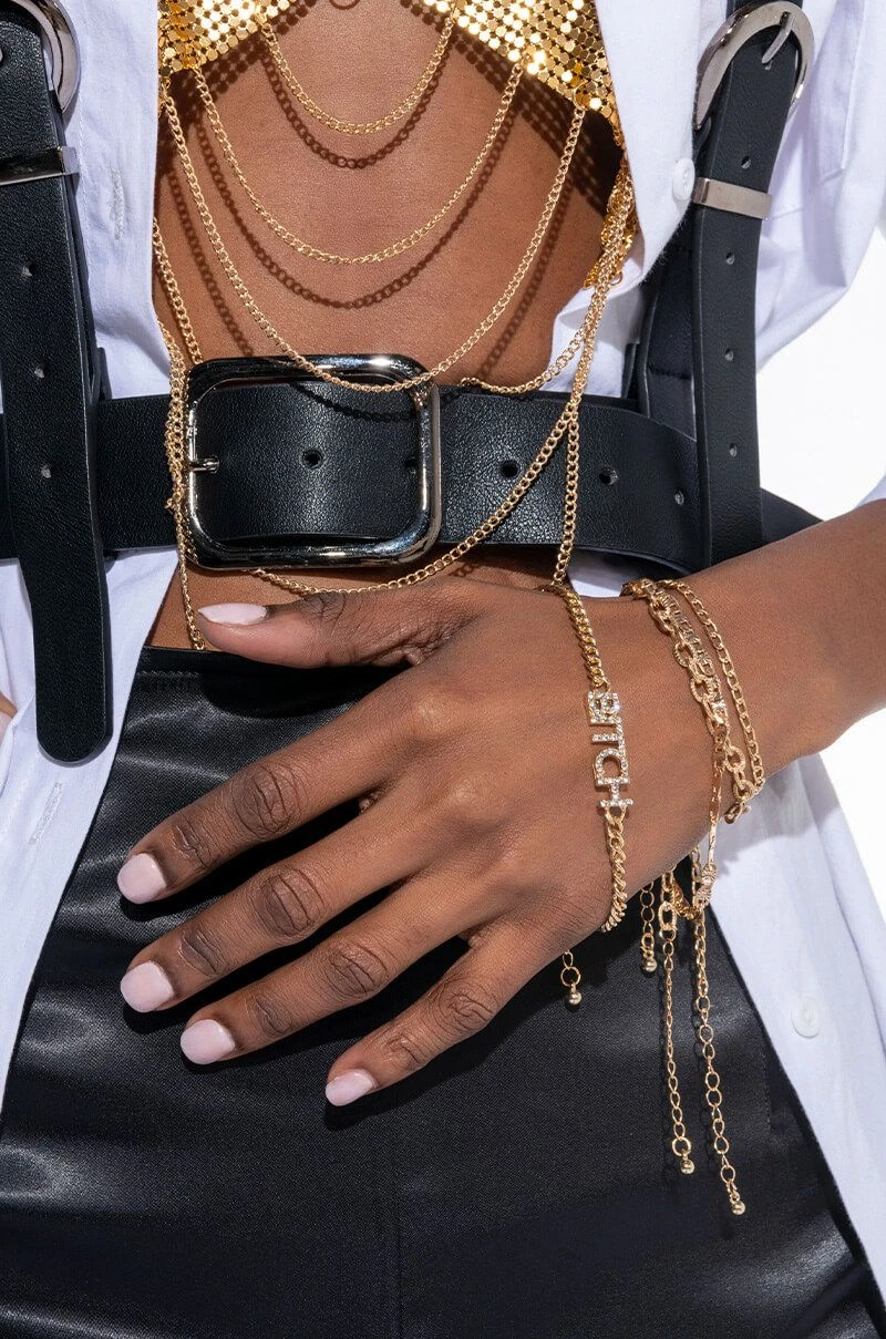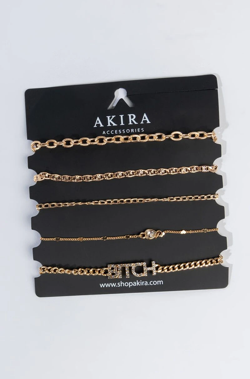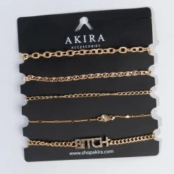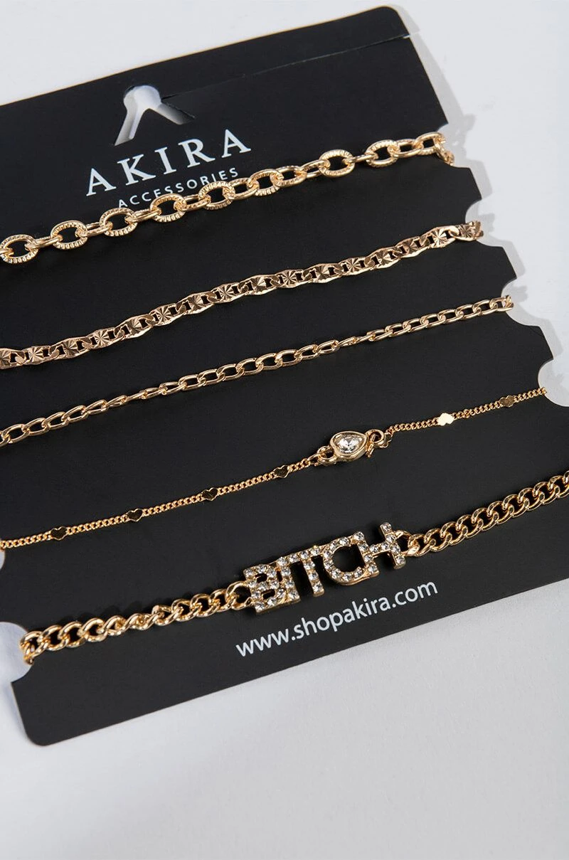 The AKIRA Label Here For It Bracelet Set features five separate gold chain link pieces. Each bracelet features a unique chain link silhouette, the final includes βBitch,β letterset pave pendant. All are complete with adjustable lobster claw fastenings.