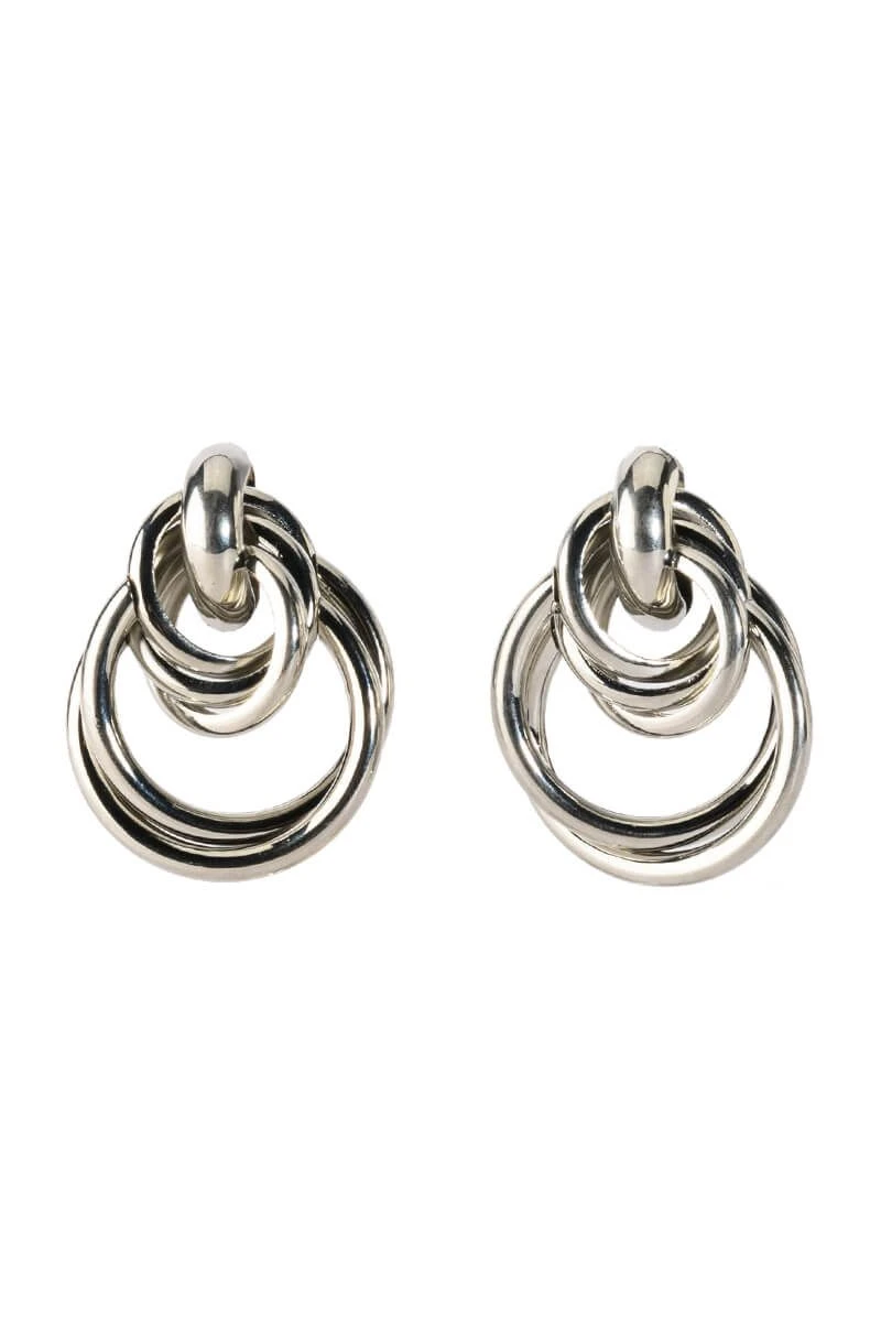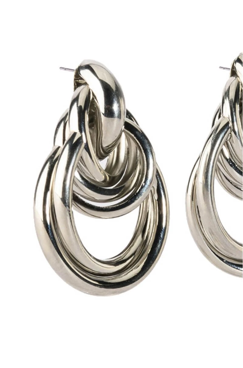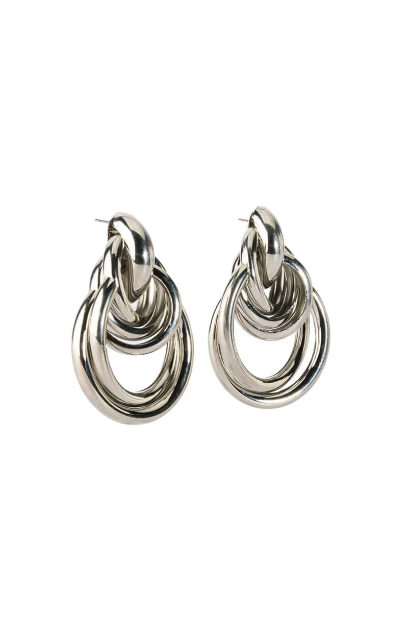 The AKIRA Label Here For It Earring is made from a faux metallic silver base and features a warped, thick cascading ring design. Complete with pushback fastenings.