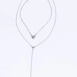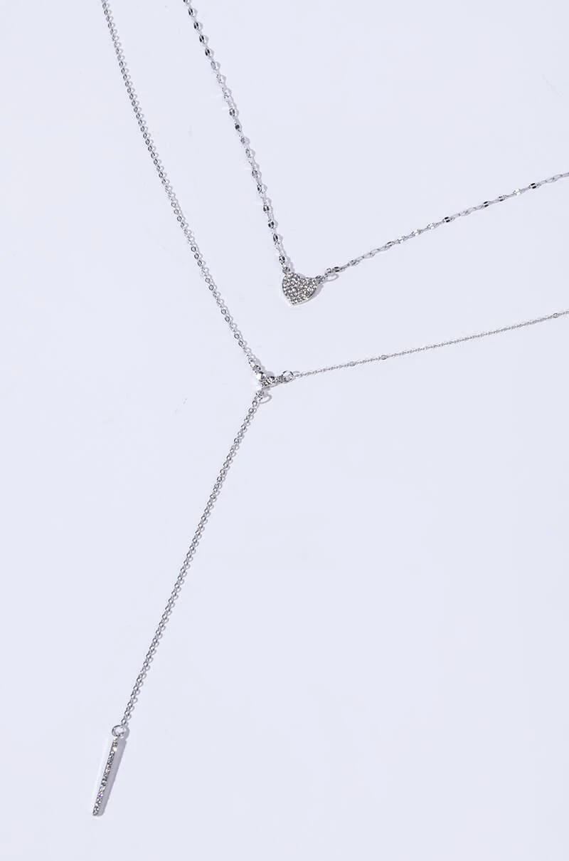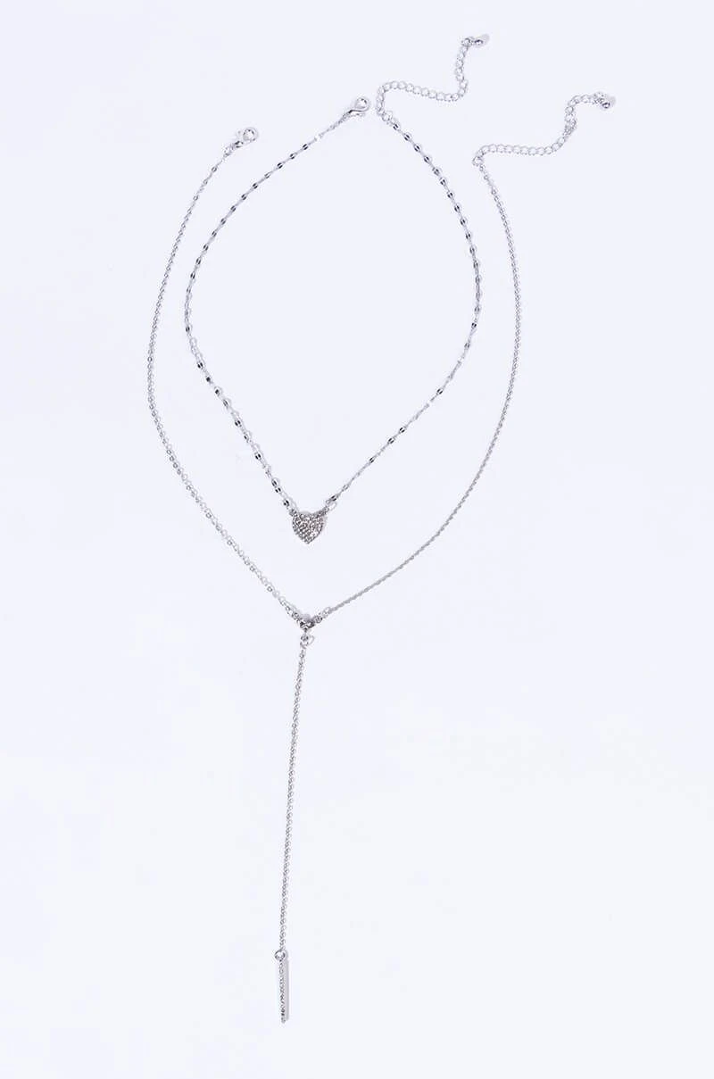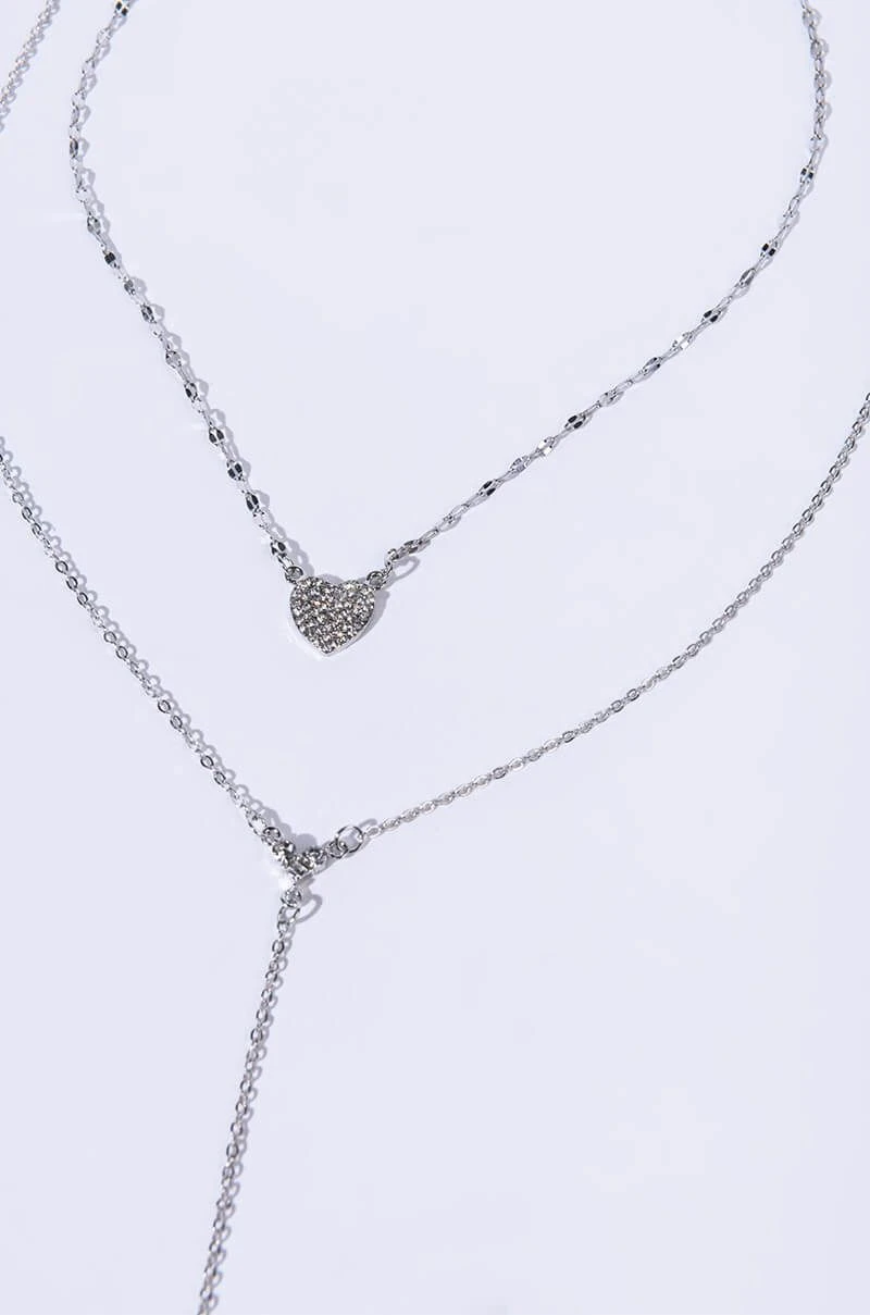 The AKIRA Label How Ya Feelโn Pave Rhinestone Necklace Set comes with a silver metallic base, and is complete with a thin chain necklace with a heart pendant, and a long drop style necklace with a rhinestone detail. Both are complete with an adjustable lobster claw closure.