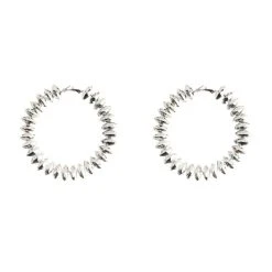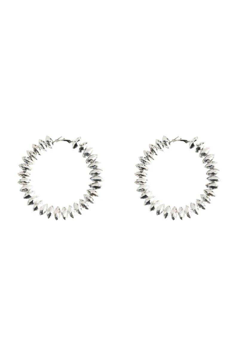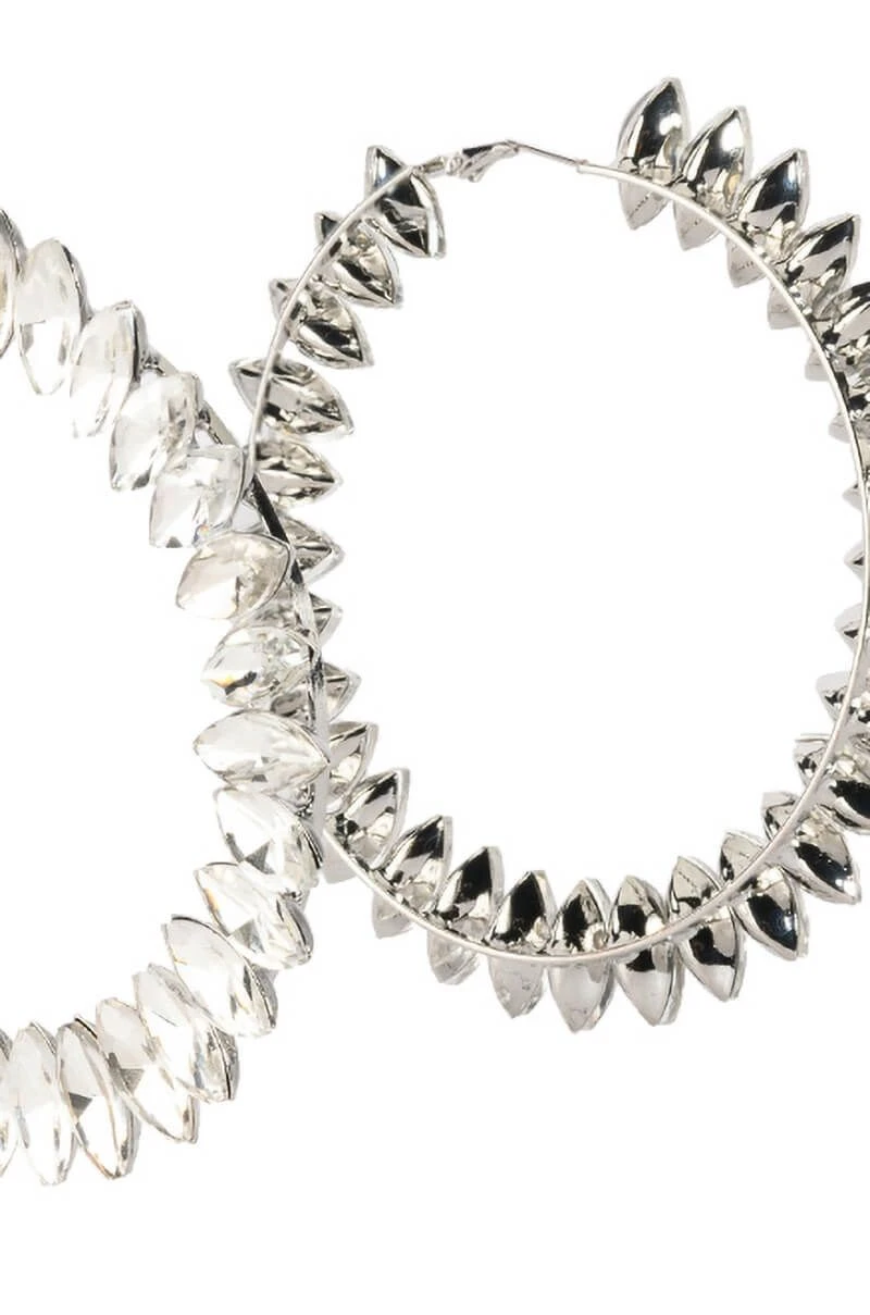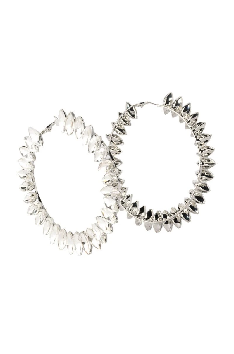 The AKIRA Label I Am Everything Hoop is an oversized hoop earring featuring a faux silver metallic base, ellipse rhinestone embellishments, a circular silhouette, and lever back fastening.