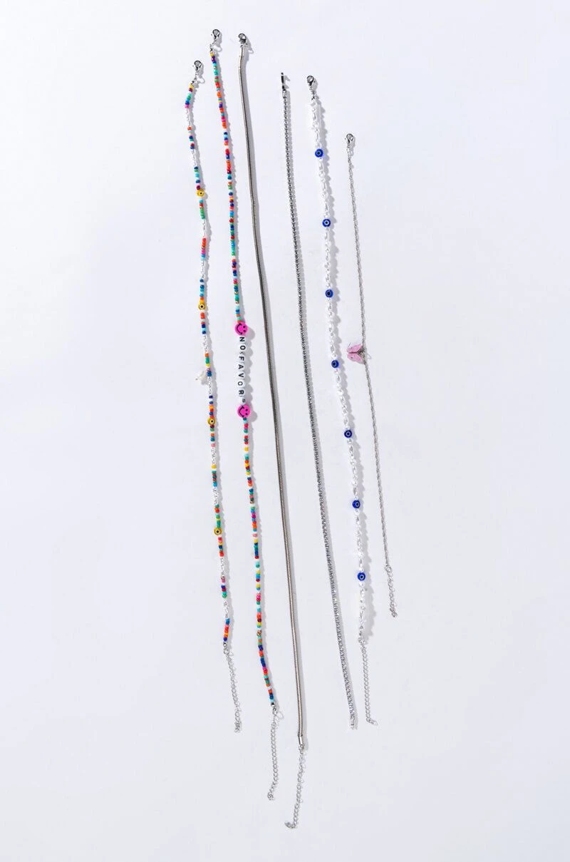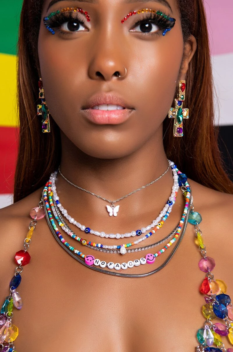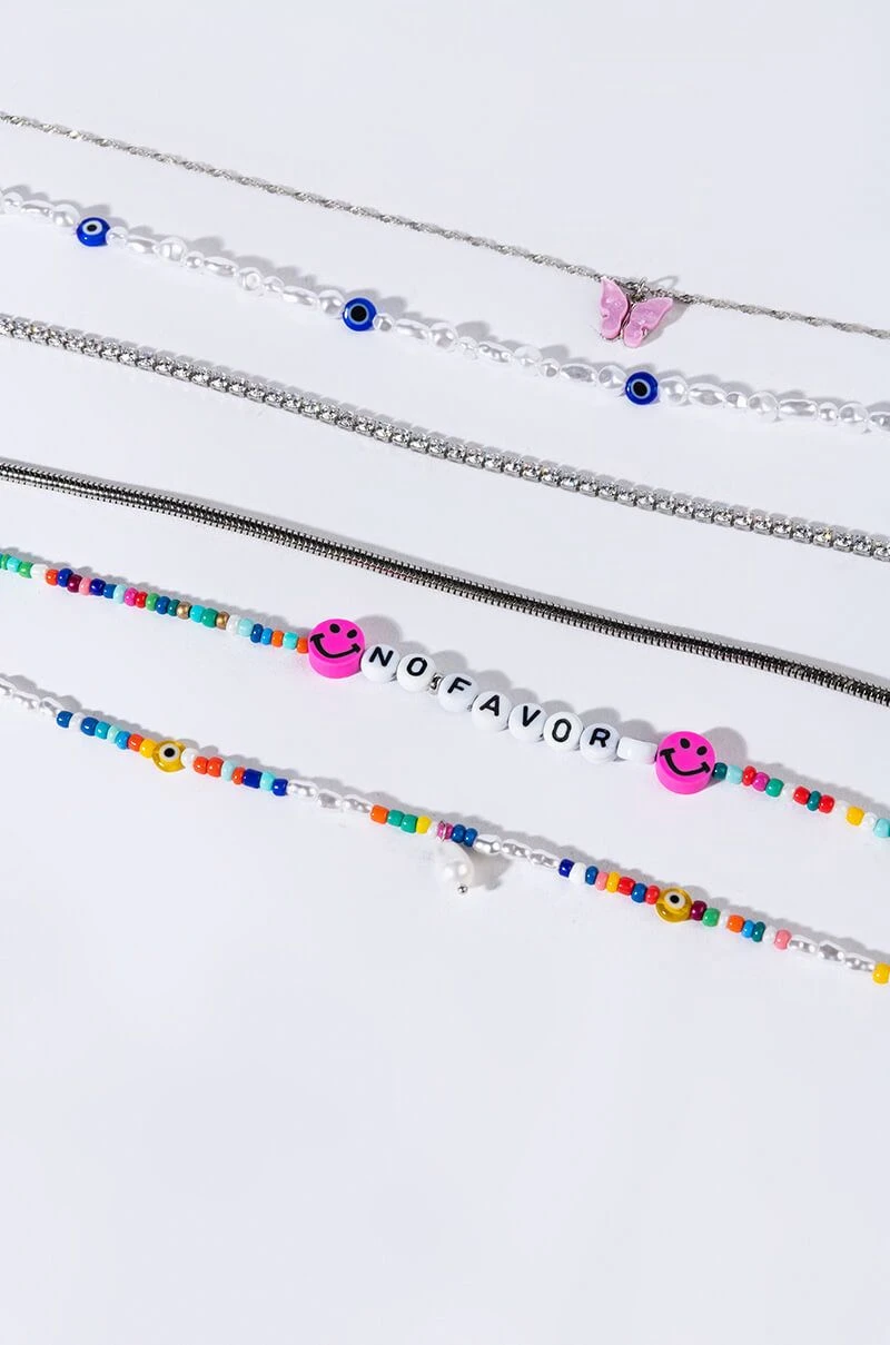 The AKIRA Label I Dont Owe You Anything Candyland Necklace Set features six unique necklaces of varying sizes and styles including: a twisted chain necklace with a resin butterfly charm and lobster clasp closure, a rhinestone chain link necklace with a foldover clasp, a snake link chain necklace with lobster clasp closure, two beaded necklaces with colorful, evil eye, and pearl beads, and a beaded necklace with colorful beads, smiley face beads, letter beads spelling out βNO FAVORSβ, and a lobster clasp closure.