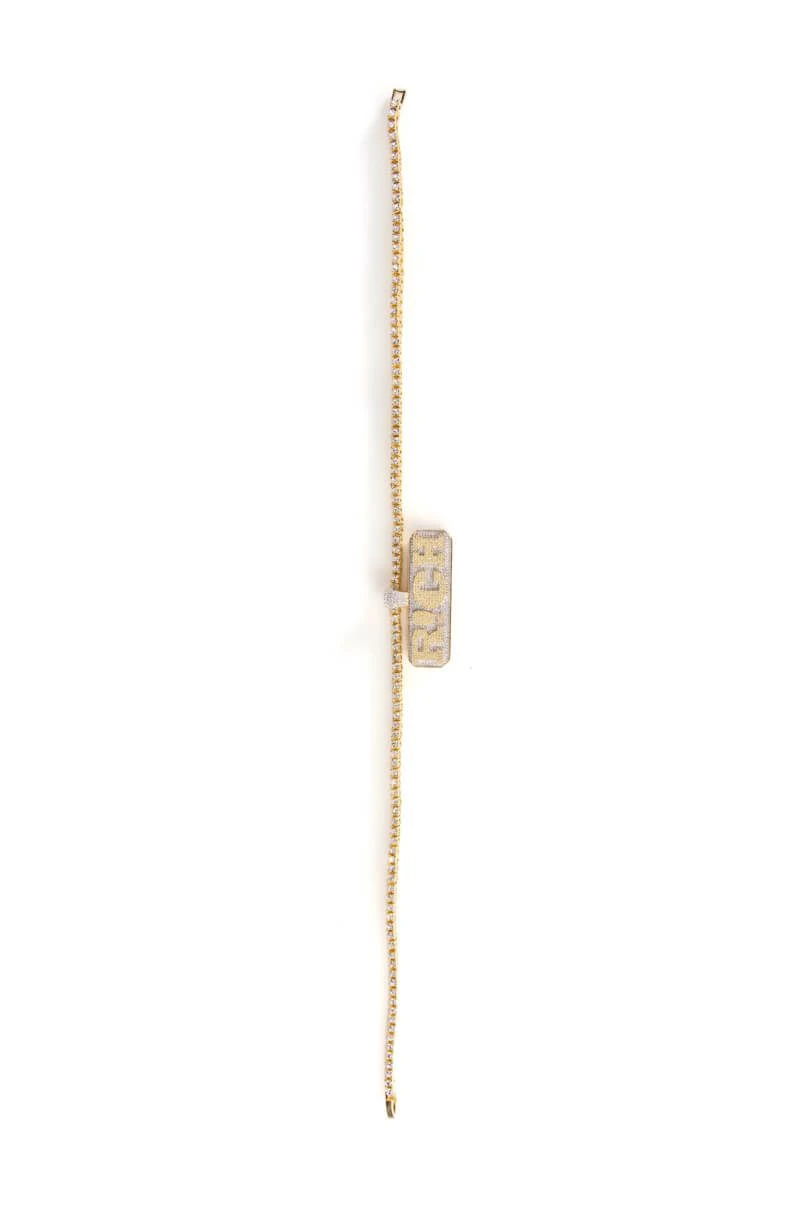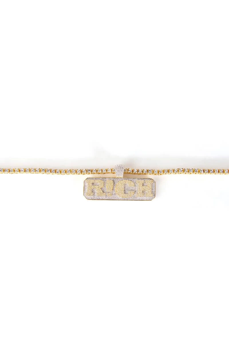 The AKIRA Label Iβm A Rich Bish Icy Necklace is made from a faux gold metal base and features a rhinestone link chain with a pave rhinestone βR!CHβ pendant. Complete with a fold-over clasp closure.
