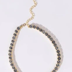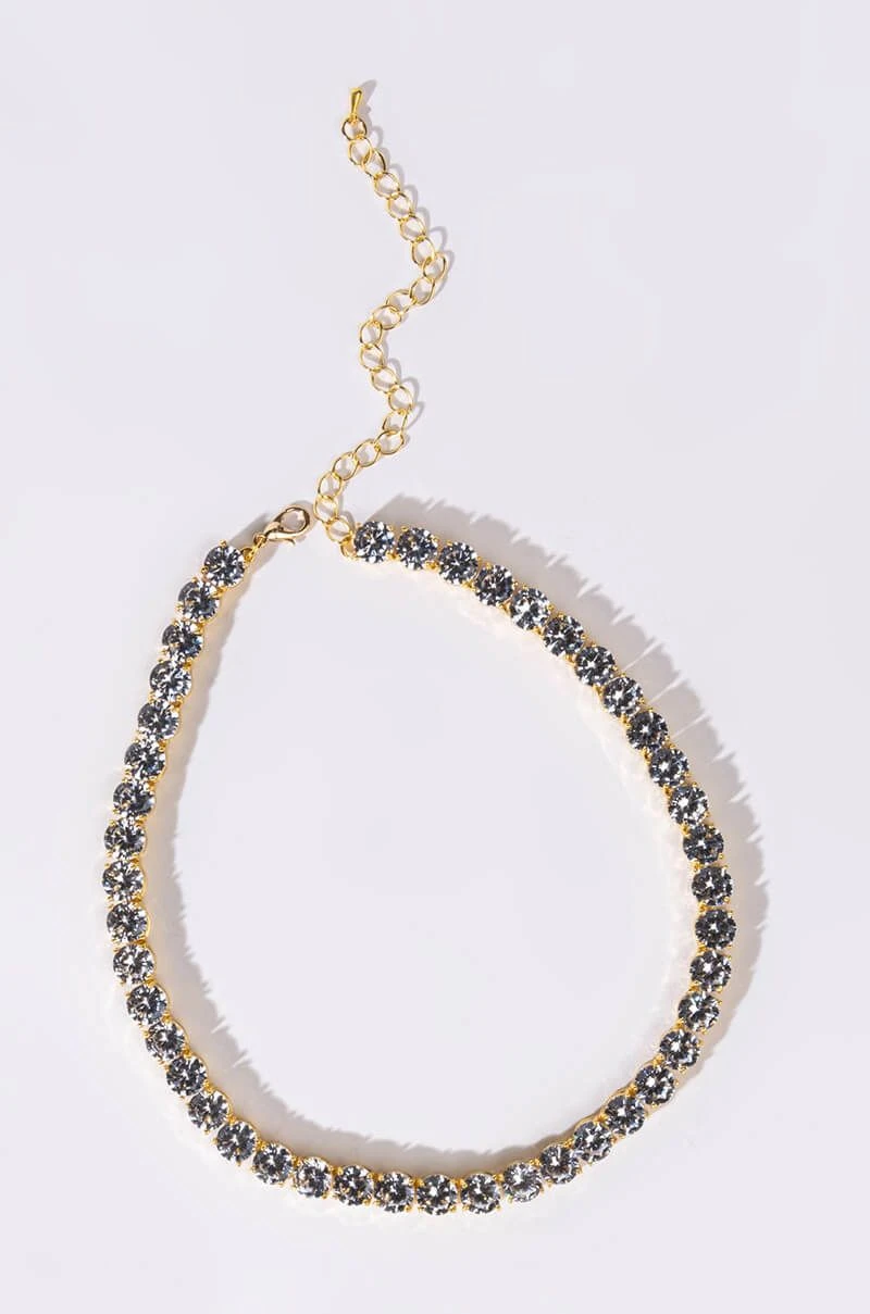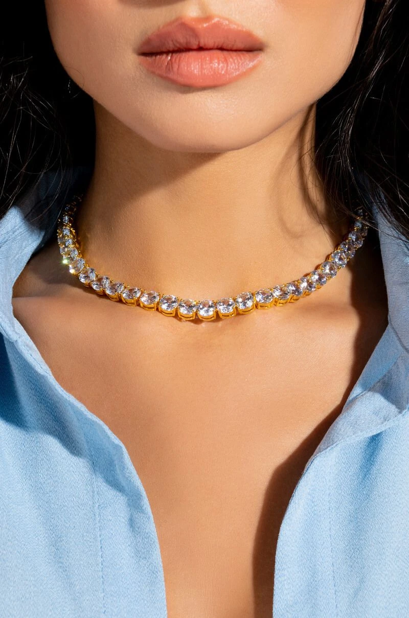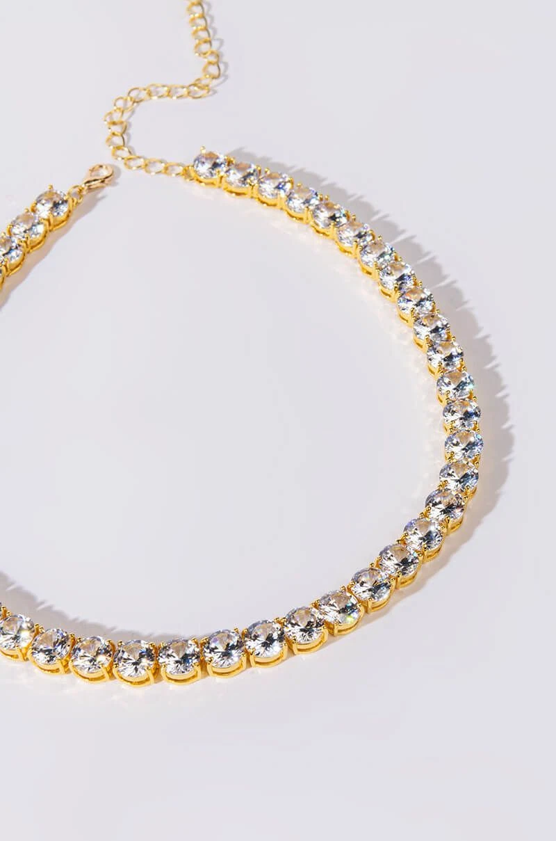 The AKIRA Label Ice On My Necklace is a luxe pave rhinestone link choker necklace made with a faux gold base and an adjustable lobster claw fastening.