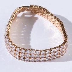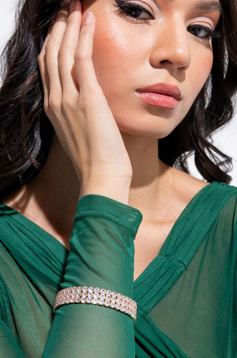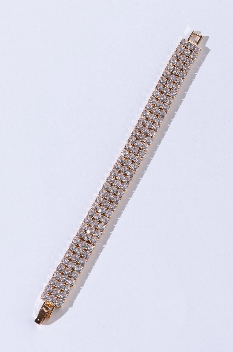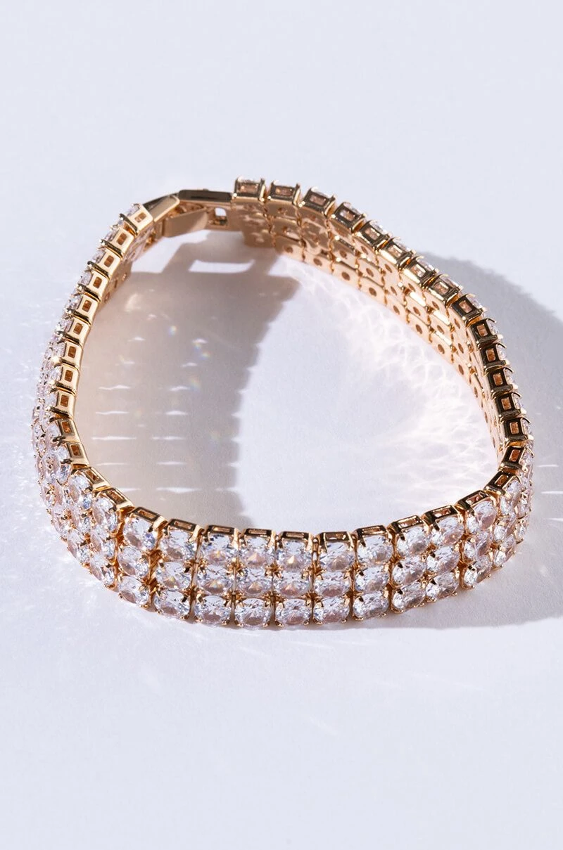 The AKIRA Label Iced Out Gold Rhinestone Bracelet is a triple stacked rhinestone link cuff bracelet, featuring super sparkly cubic zirconia stones, a faux gold base, and latch back fastening.