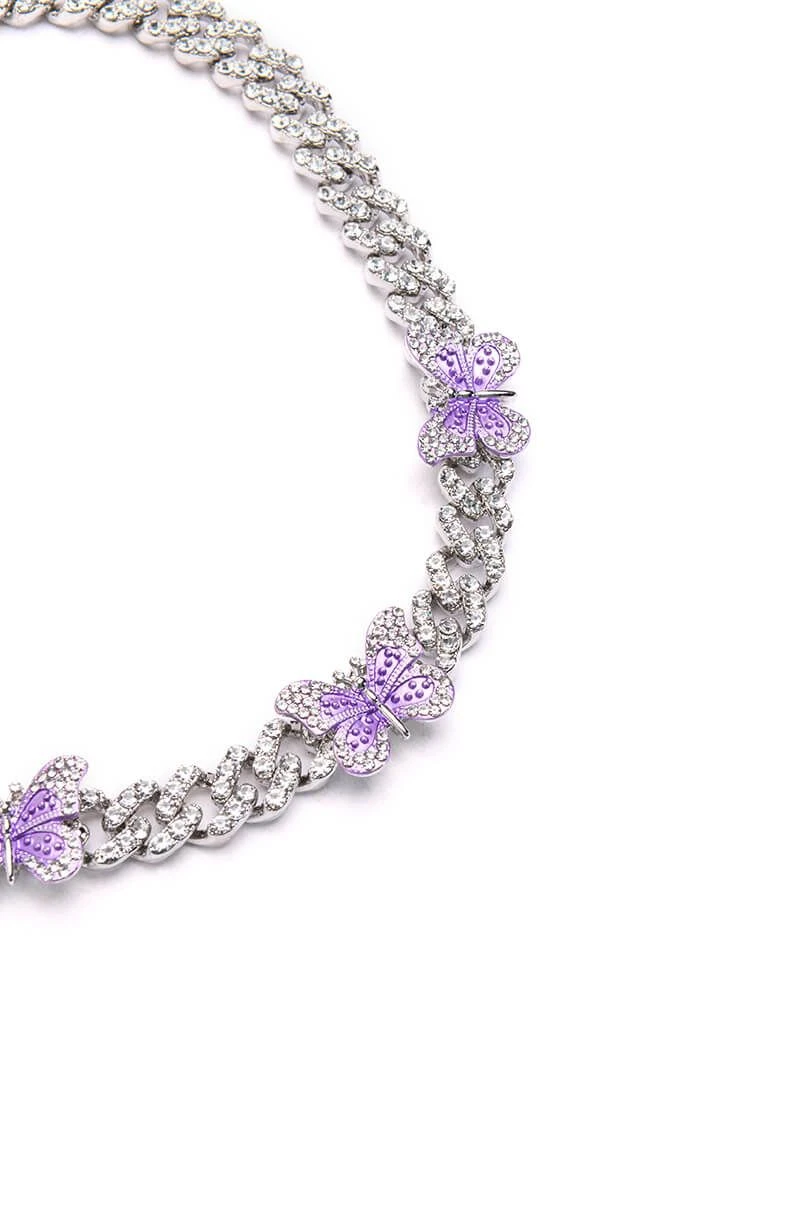 The AKIRA Label Iced Out Rhinestone Butterfly Chain Necklace is made from a faux silver metal and features a pave curb chain link base with rhinestone-embellished metal butterfly charms. Complete with a buckle closure.