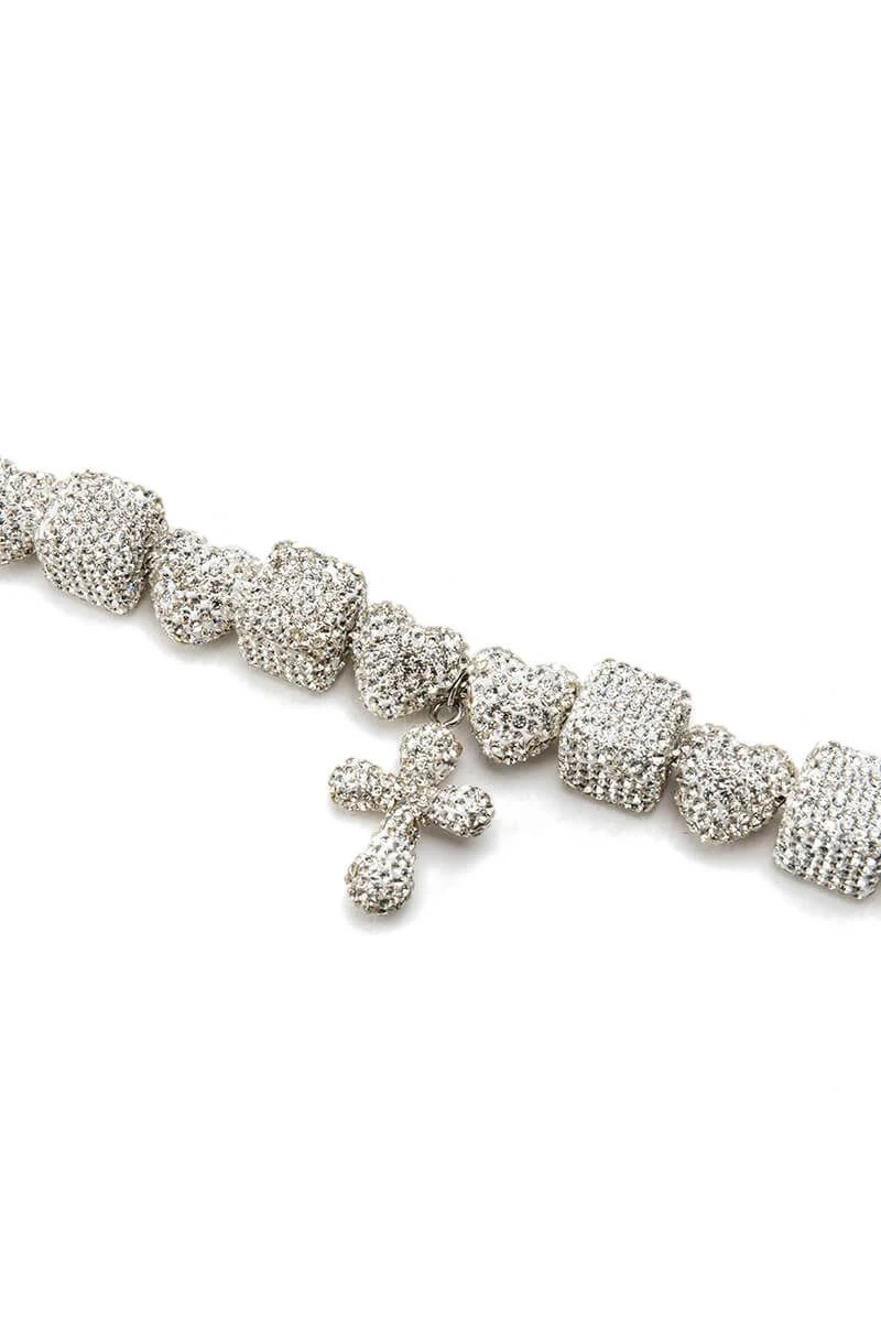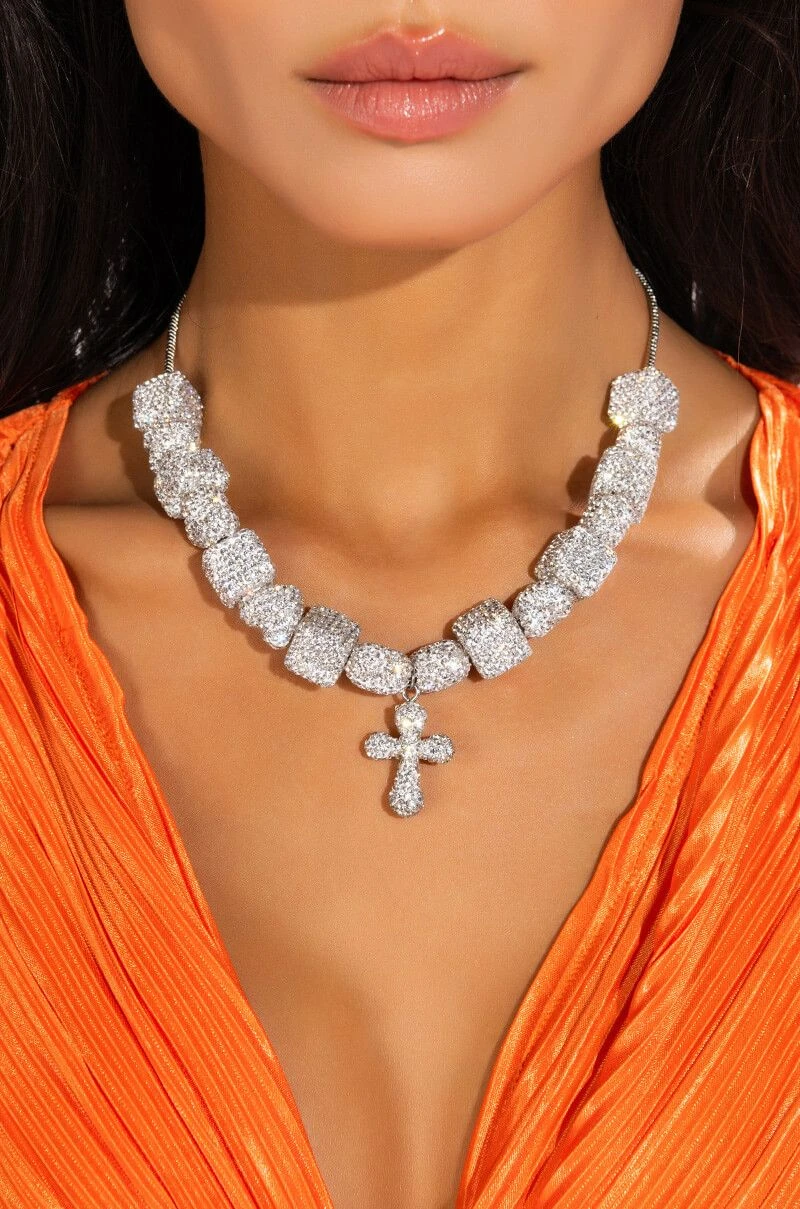 The AKIRA Label In Drop I Trust Necklace is made with a silver snake chain link base and features rhinestone cube and heart charms with a rhinestone cross pendant. Complete with an adjustable lobster claw closure.