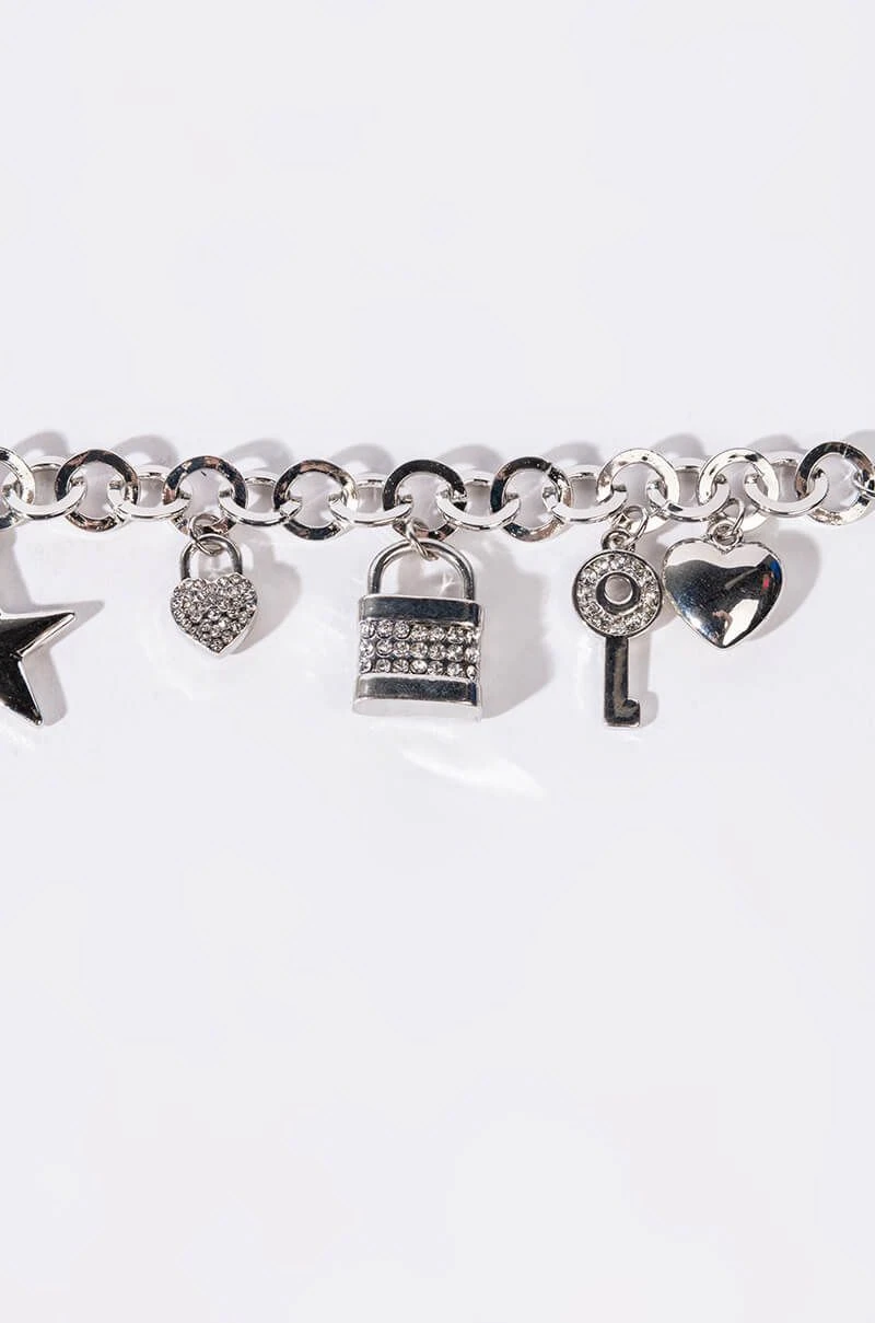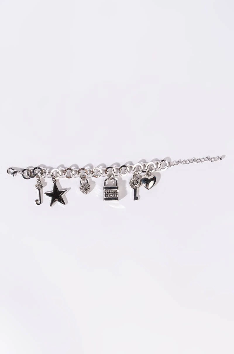 The AKIRA Label Key To My Heart Dainty Bracelet features a faux silver round link chain design, rhinestone lock, key, heart, and star charms, and a lobster claw closure.