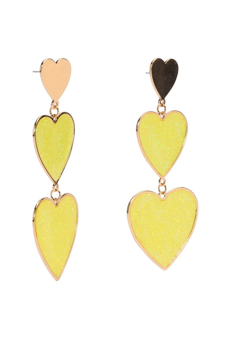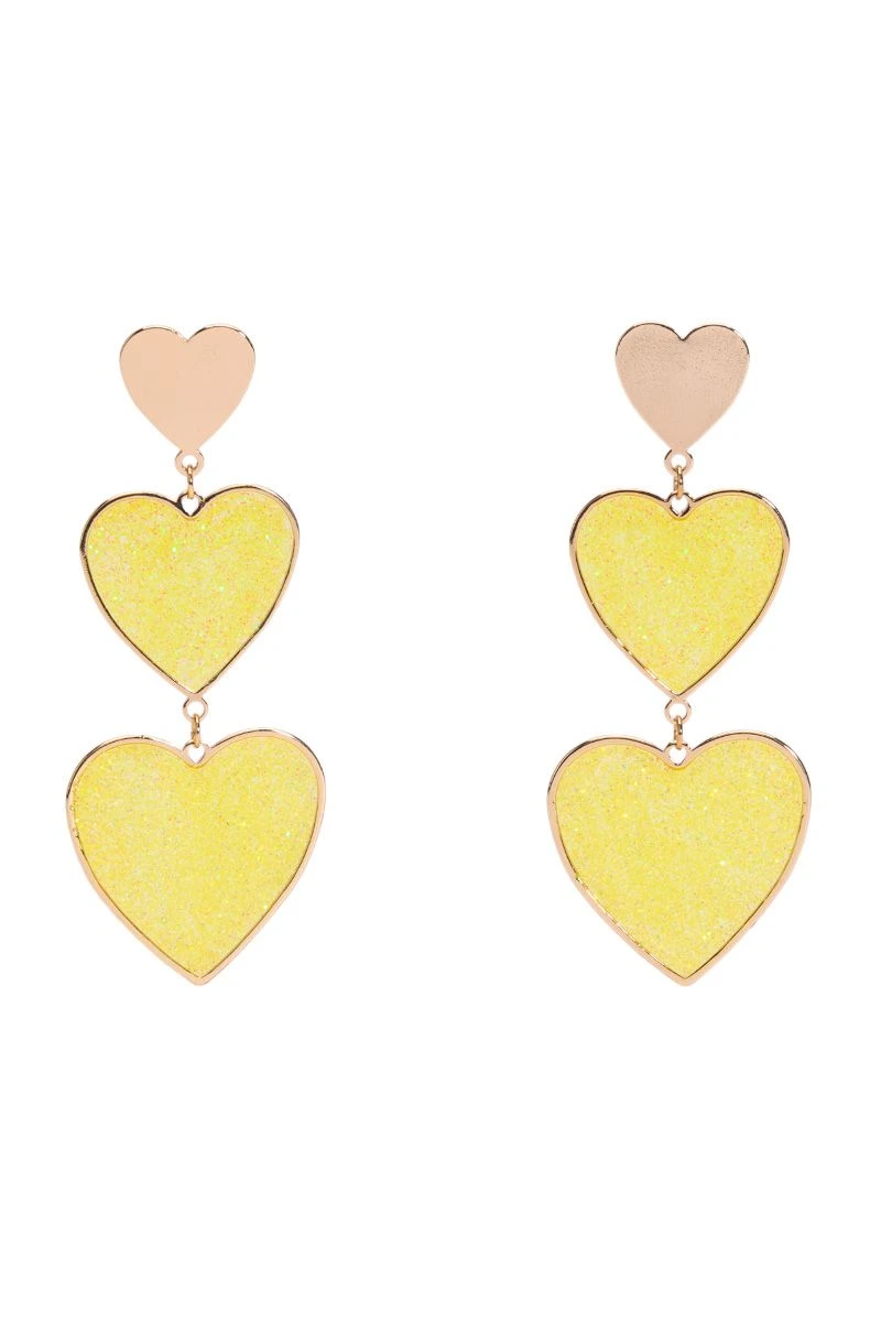 The AKIRA Label Lil Bit Of Lovin Glitter Drop Earrings are made from a faux gold metal base and feature a gold heart lobe post and a drop silhouette with metal trim glitter hearts of increasing size. Complete with post back fastenings.