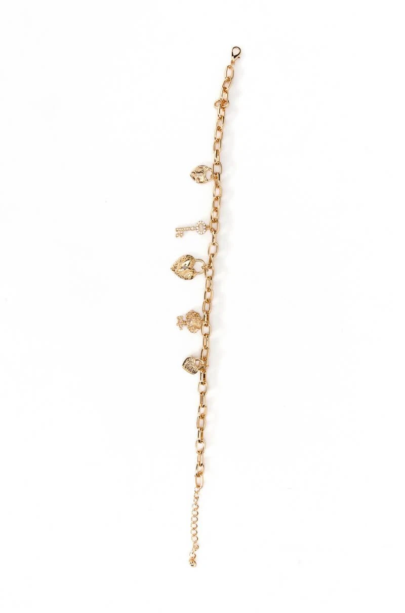 The AKIRA Label Locked Down Charm Chain Necklace is made from a faux gold metal base and features an elongated paperclip chain with ornate heart lock and key charms. Complete with an adjustable lobster claw closure.