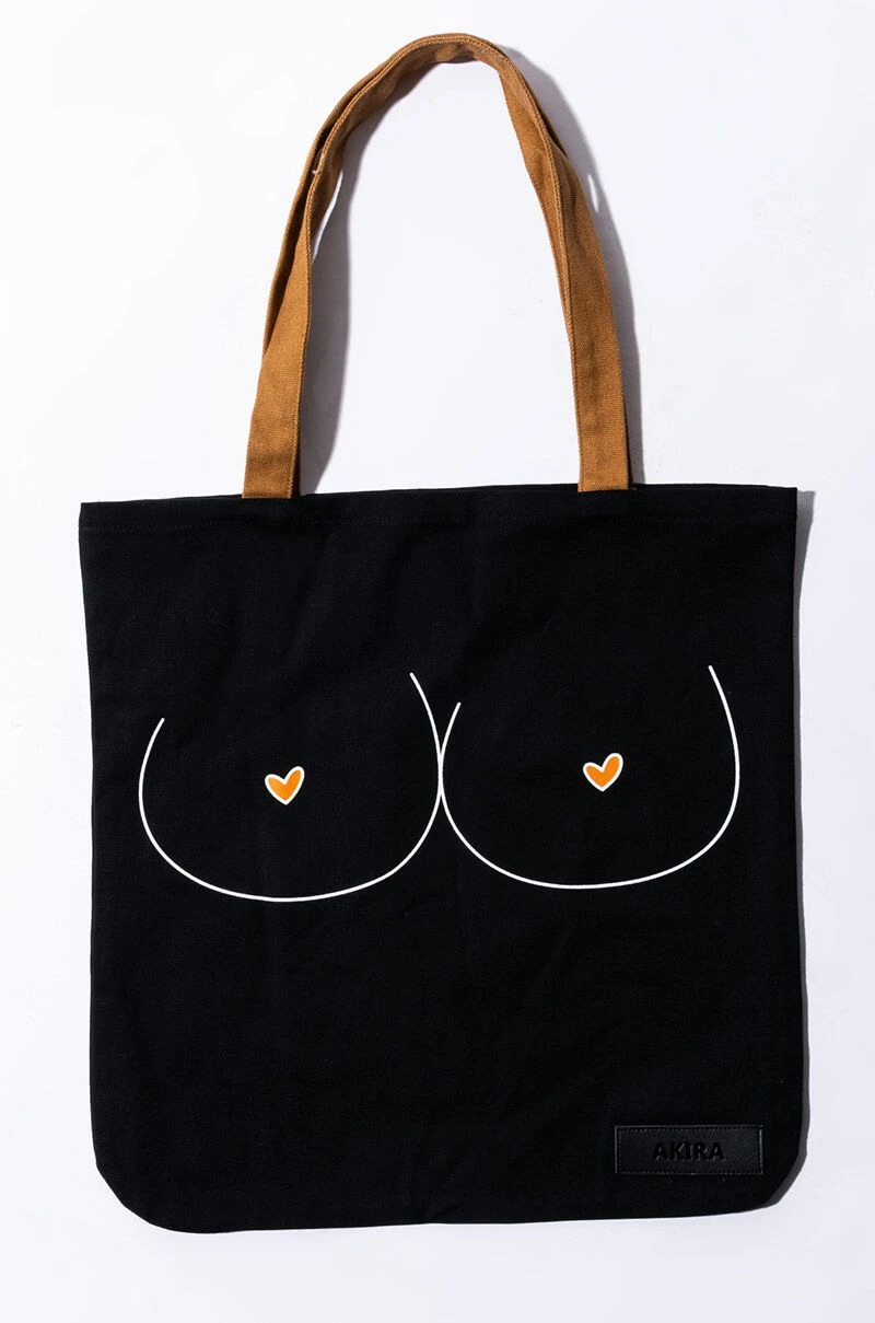 Spread the love with The AKIRA Label Love Is Love Canvas Tote! This top handle tote features a woven body, a printed underbust graphic with heart nipples, and a faux leather AKIRA label at the bottom. Perfect for pride, shopping, or on-the-go!