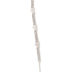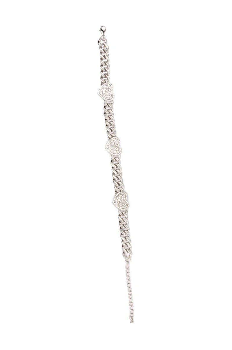 The AKIRA Label Lover Girl Rhinestone Chain Choker is made from a faux silver metal base and features a pave rhinestone curb chain with pave rhinestone heart charms and an adjustable lobster claw closure.