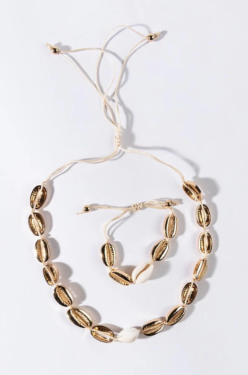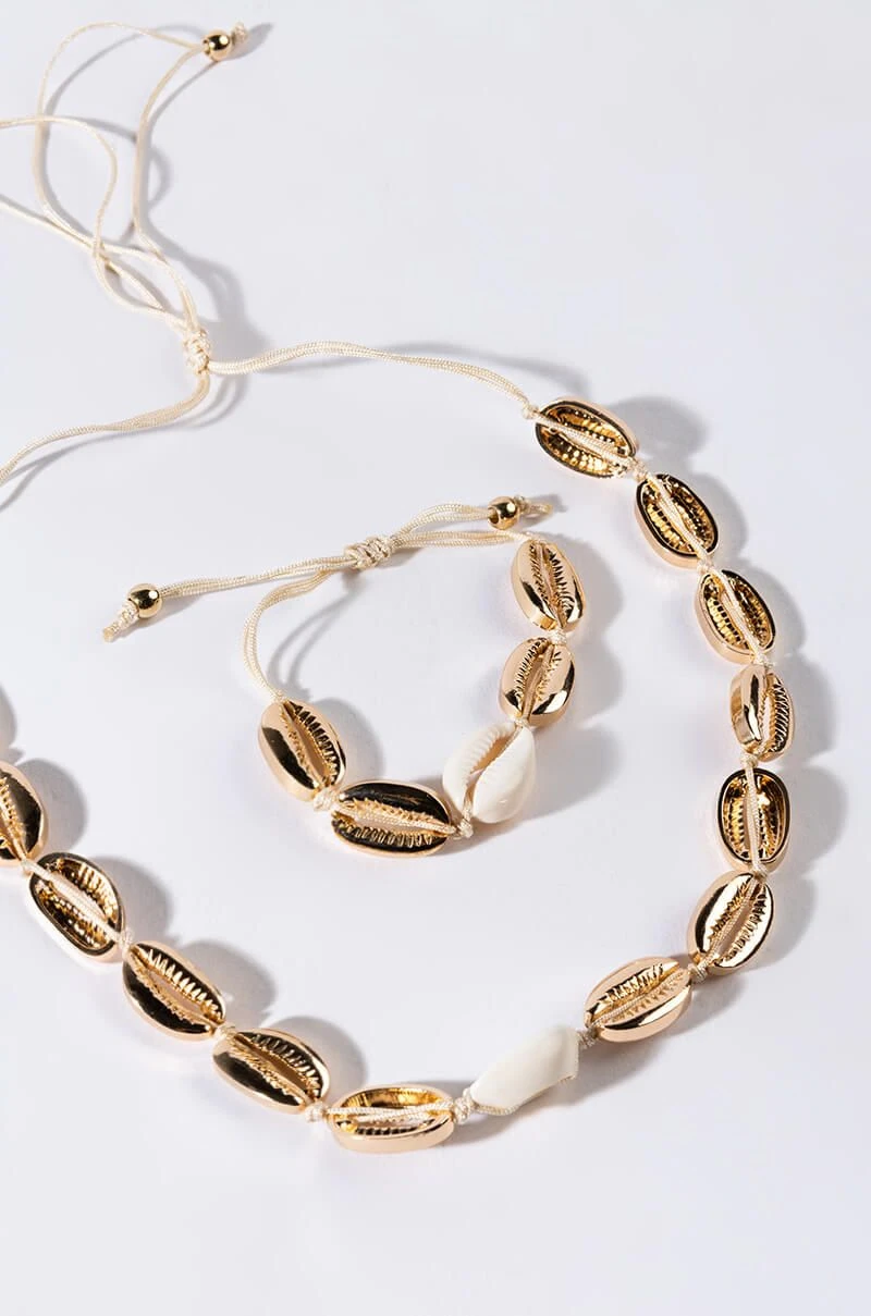 The AKIRA Label Martinique Necklace Set is a playful choker necklace featuring a summer camp-inspired adjustable string base, faux gold cowrie shell detailing, plastic shell accents, and an adjustable drawstring-like closure. This set is complete with a coordinating, adjustable bracelet.