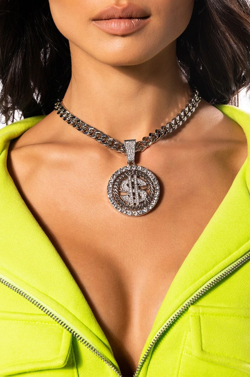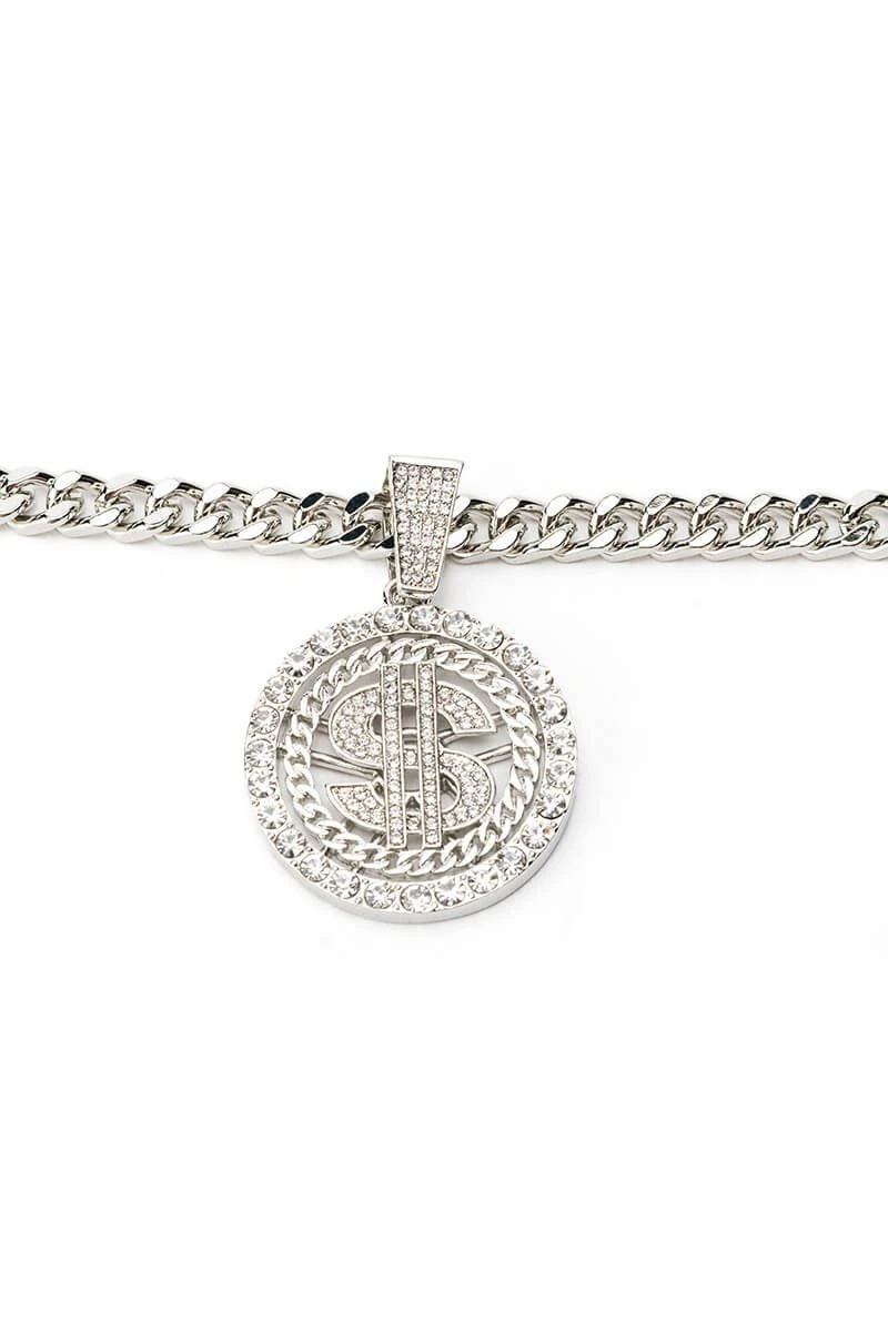 The AKIRA Label Money Honey Ice Statement Pendant is a silver metallic curb chain necklace featuring a removable circular pave pendant with dollar sign symbol. Complete with an adjustable lobster claw fastening.