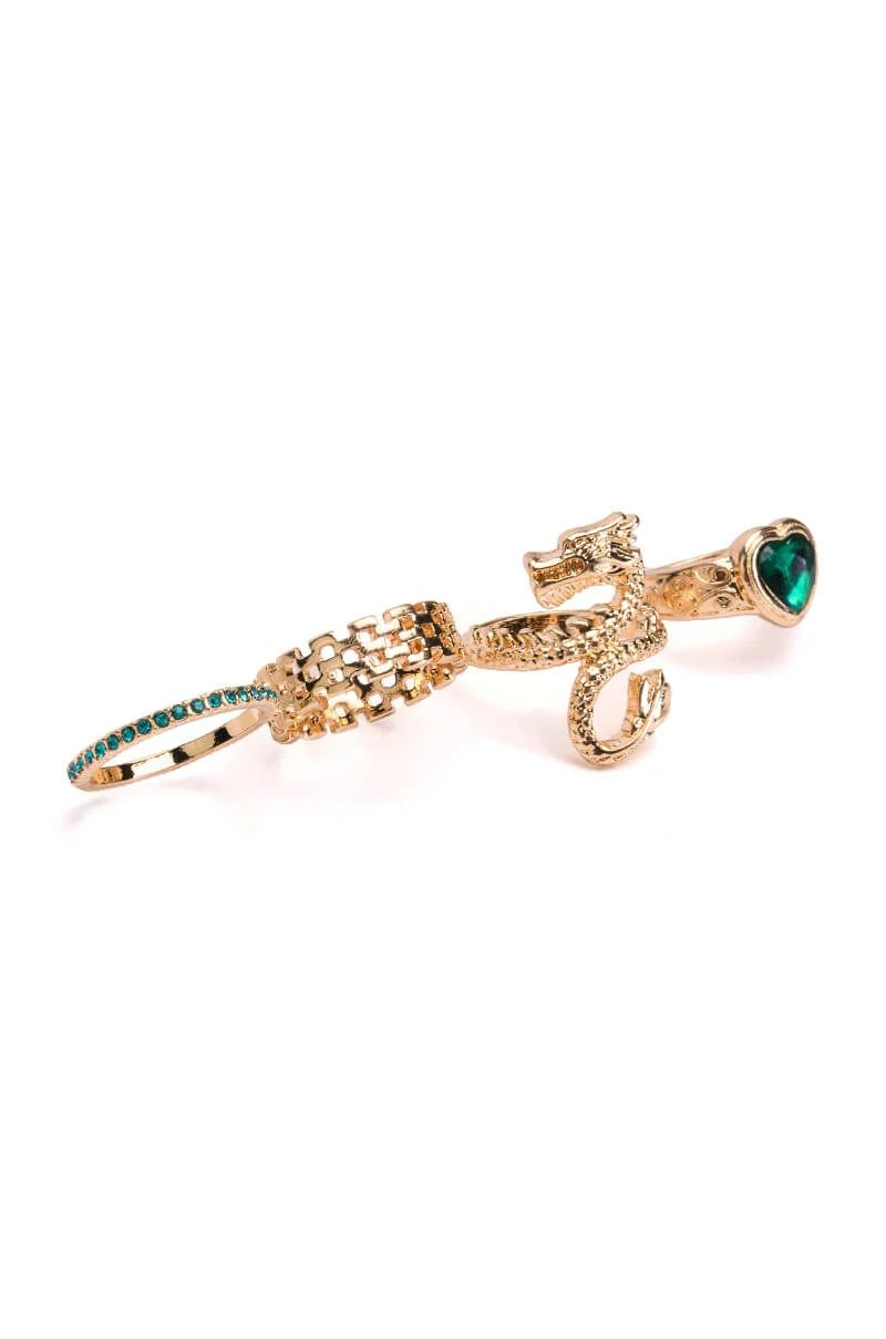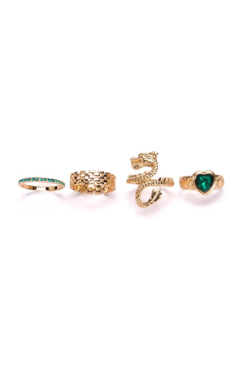 Weβre seeing green! The AKIRA Label Money Maker Ring Set includes four faux gold rings. One features an intricate dragon motif, one displays a green heart-shaped gemstone, one is a slim green gemstone-laden band, and the final is a textured checkered cut out ring. Stack them up or wear them individually to add some sparkle to your next going-out look!