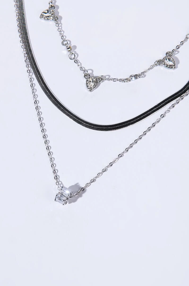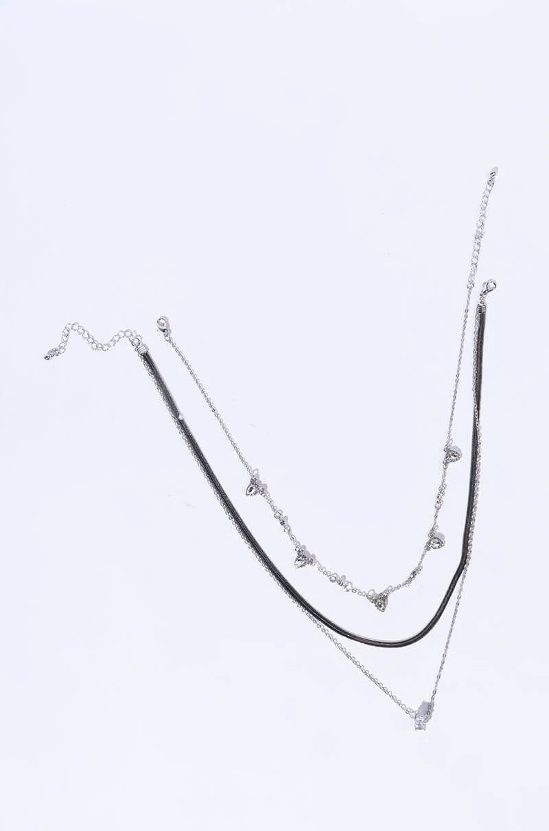 The AKIRA Label My All Silver Necklace Set is a set of two faux silver necklaces and is complete with a rhinestone embellished choker, a silver band with an attached chain link necklace with rhinestone pendant. Each necklace is complete with a lobster claw closure.