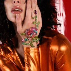 The AKIRA Label My Secret Garden Luxe Gem Bracelet Ring Combo is an ultra-ornate statement piece featuring a metallic construction and a vibrant rhinestone-encrusted climbing vine-inspired bracelet base. This intricate piece includes a floral motif that travels along the hand, culminating in a teardrop rhinestone-embellished ring. Complete with elastic backing, this one-size-fits-most piece stretches to slip on the wrist.
