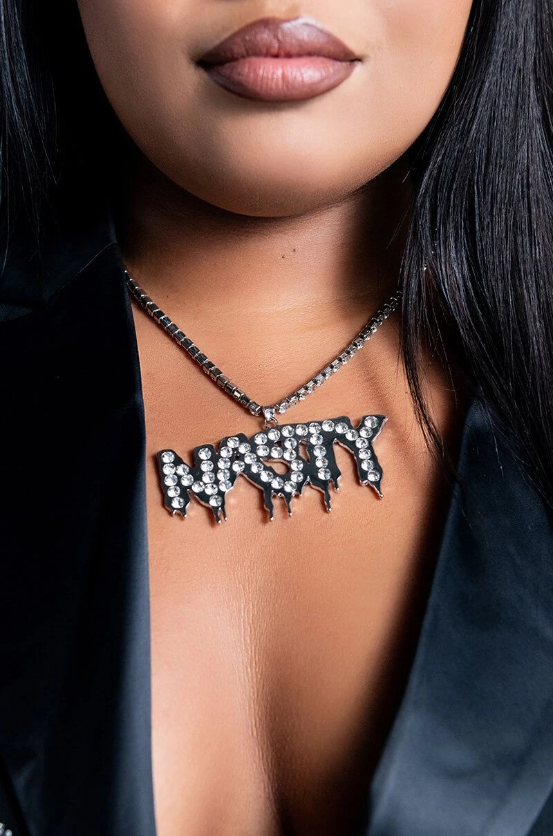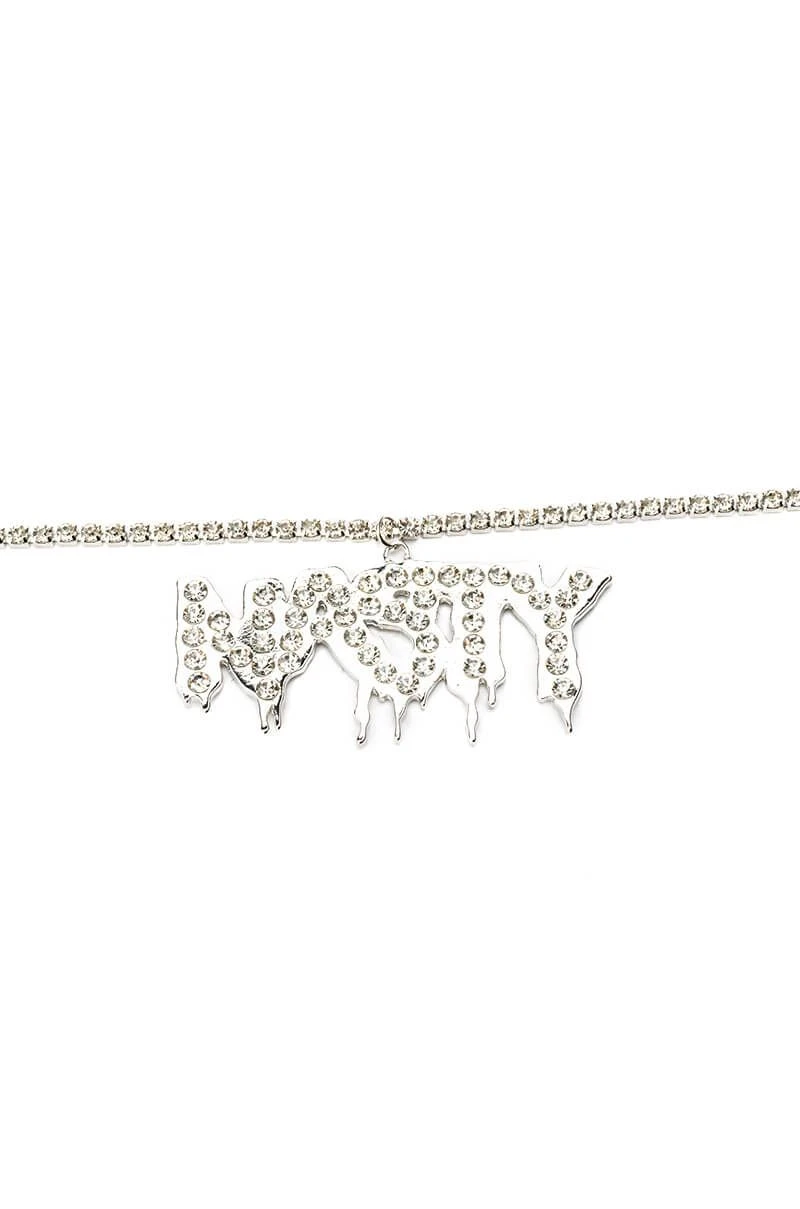 The AKIRA Label Nasty Rhinestone Necklace is a fierce, blinged-out necklace made from a faux silver metal featuring a rhinestone chain link base, a drippy rhinestone-detailed “NASTY” text metal nameplate pendant, and an adjustable lobster claw closure.