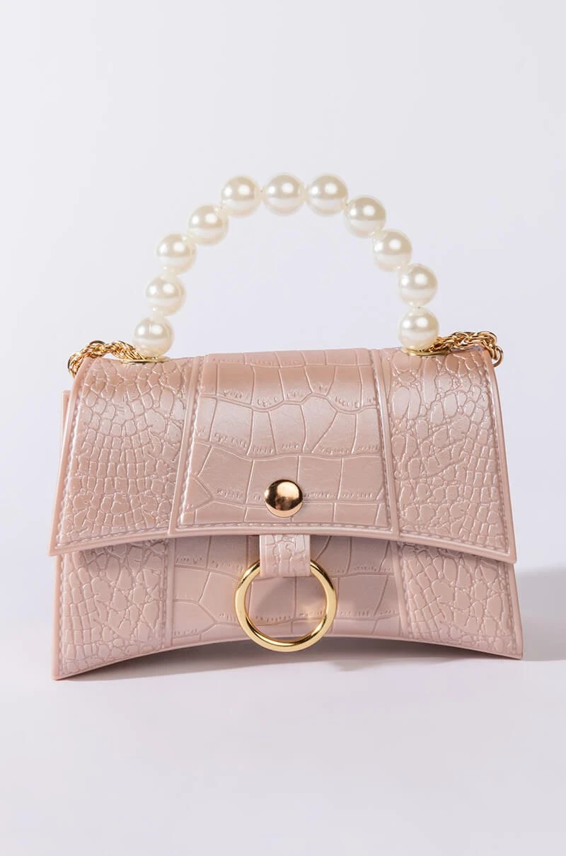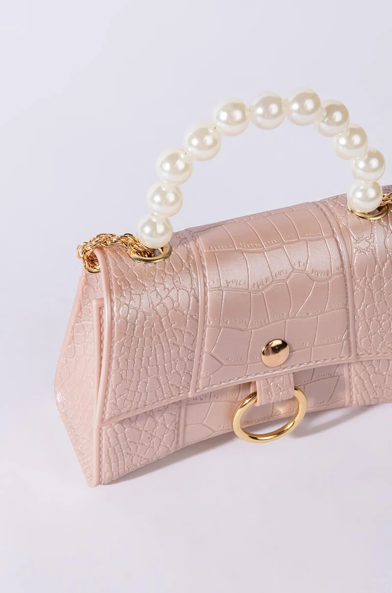 The AKIRA Label Not A While Crocodile Beige Mini Bag features a structured rubber fabrication base, embossed croc patterning, a pearl detail top handle strap, and a chain link shoulder strap. Complete with a front flap, magnetic snap button closure, gold ring front detail, and an inner pocket.