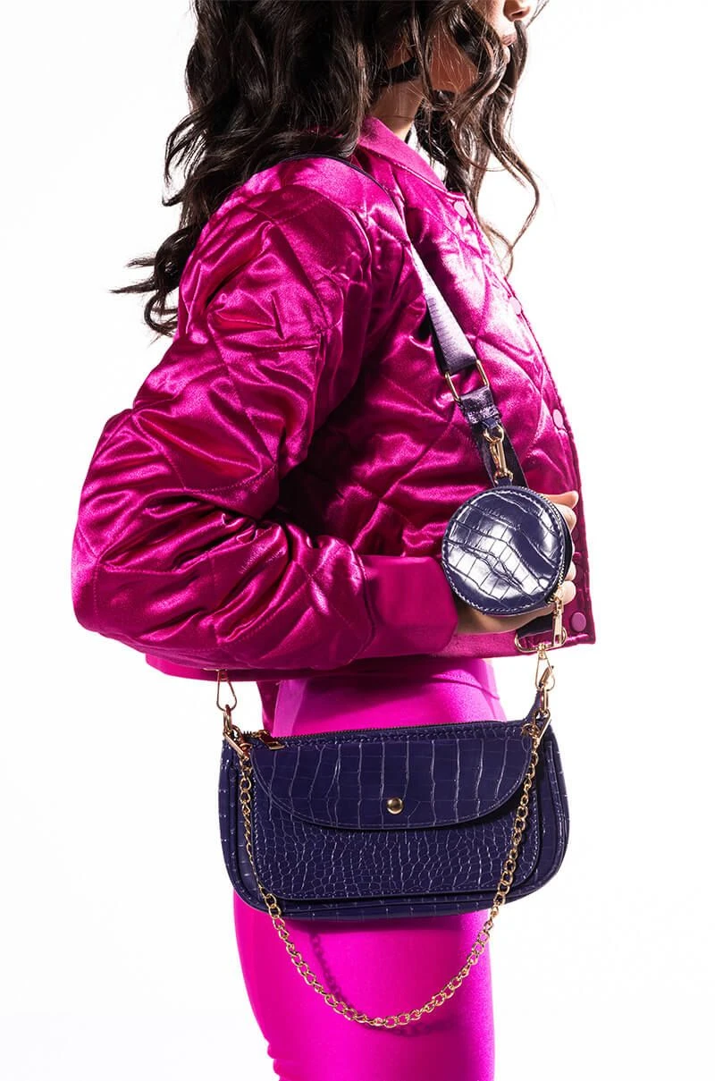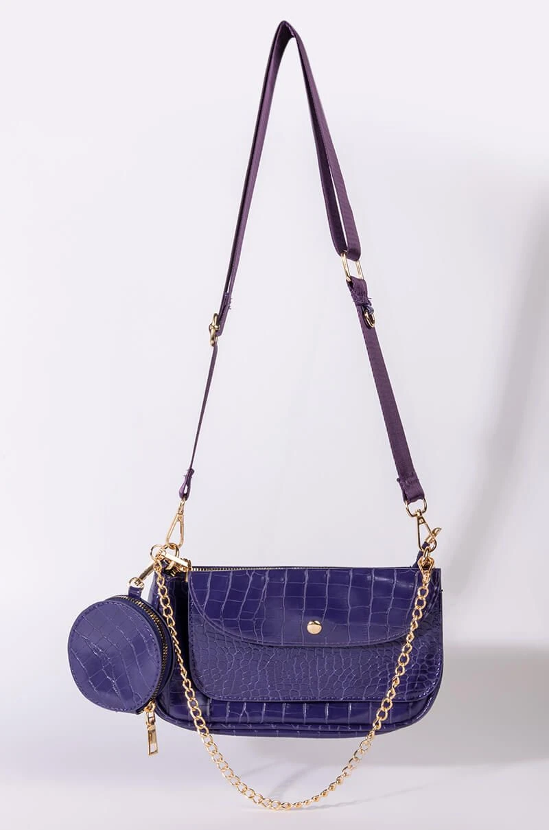 The AKIRA Label On Periodt Croc Eggplant Baguette is a chic baguette bag featuring a collage of clutches encapsulated in one chic convertible piece. This croc-embossed vegan leather number includes a slim zip top baguette bag base, an adjustable woven shoulder strap, a detachable flap front envelope clutch with chain link handle, and a detachable circular zip top pouch.